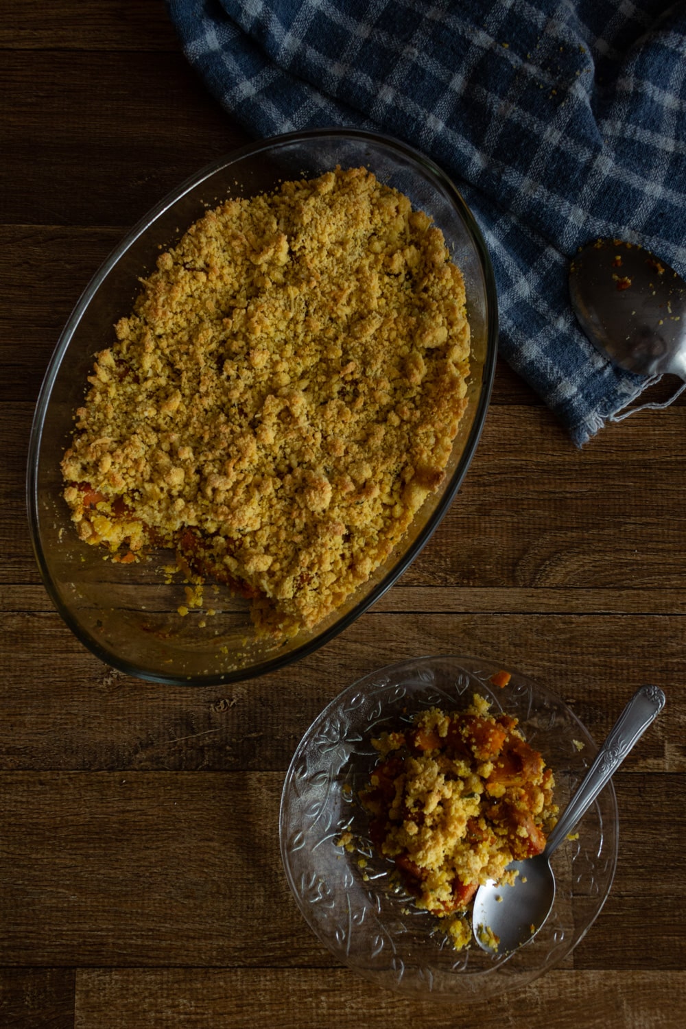 Aliás, o nome original dessa receita é Crumble de Abóbora, mas eu tô realmente tentando evitar nomes estrangeiros que não sejam muito familiares. De qualquer forma, pra quem não conhece um crumble, ele é um recheio macio e assado sobre uma cobertura de farofa que pode ou não formar uma massinha depois de assada. Normalmente é uma receita doce, feita com frutas assadas junto de açúcar e algumas especiarias, e coberta com uma farofa que normalmente contem aveia mas pode ter até castanhas e nozes no meio.