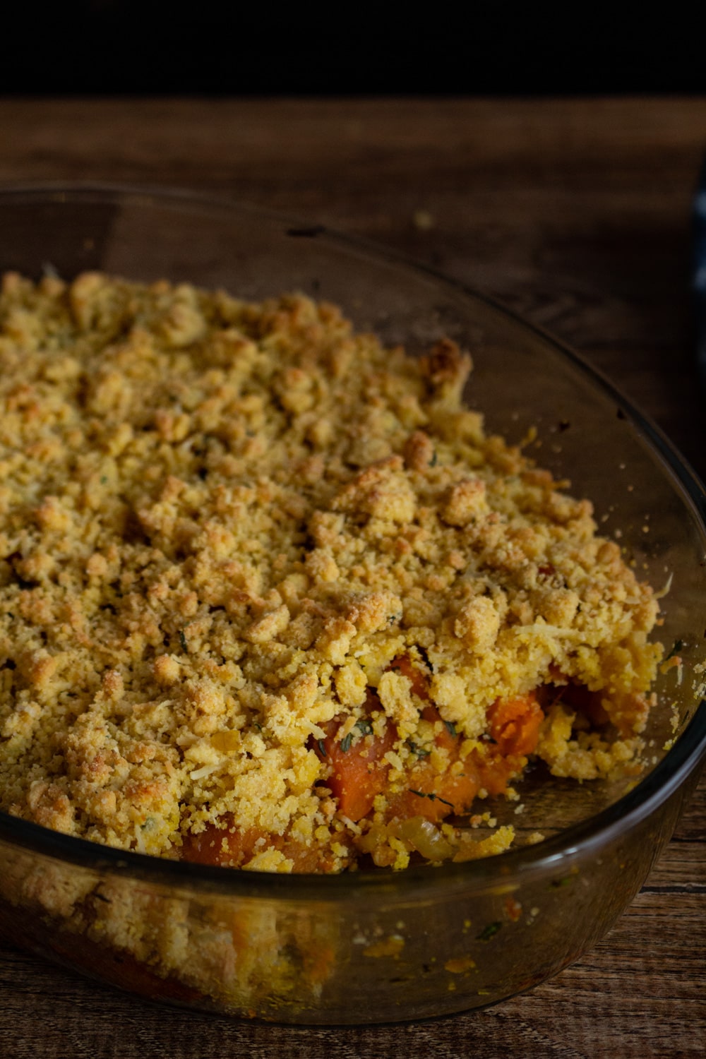 Farofa de fubá aromática e crocante cobrindo abóboras assadas e também bem aromáticas pra fazer o primeiro crumble salgado dessa cozinha!