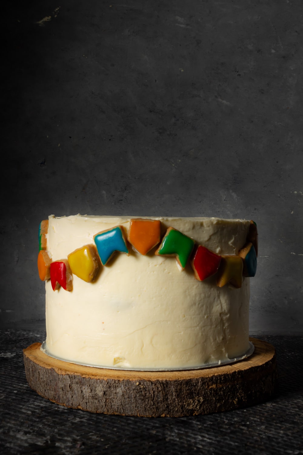 Por último, porque esse texto já tá imenso, as bandeirinhas! Eu usei a massa que mais confio pra manter o formato: o biscoito de gengibre das casas de natal. Fiz 1/4 da massa, cortei quadradinhos de 2x2cm e depois cortei cada quadradinho no formato da bandeirinha. Congelei os biscoitos enquanto descansava os dedos e depois assei. Depois de frios eles ganharam uma cobertura de glacê simples (açúcar de confeiteiro + água + corante) e secaram até a hora de ir pro bolo. É claro que essas bandeirinhas podem ser feitas de outros materiais como chocolate ou pasta americana por exemplo. Ufa, acho que é isso. Qualquer dúvida é só chamar nos comentários. E se fizer o seu bolo junino, me conta como ficou? Eu vou adorar saber!!