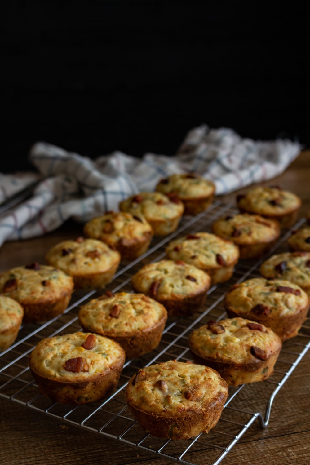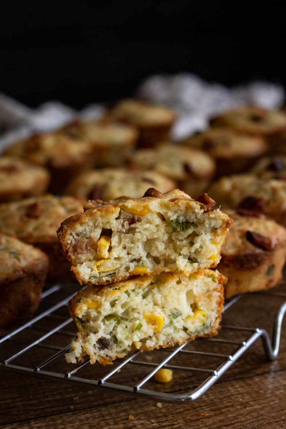 Muffins de milho, ou seja salgados, com pedacinhos de bacon, queijo e ervas e uma massa muito simples. E claro, várias oportunidades de substituição!