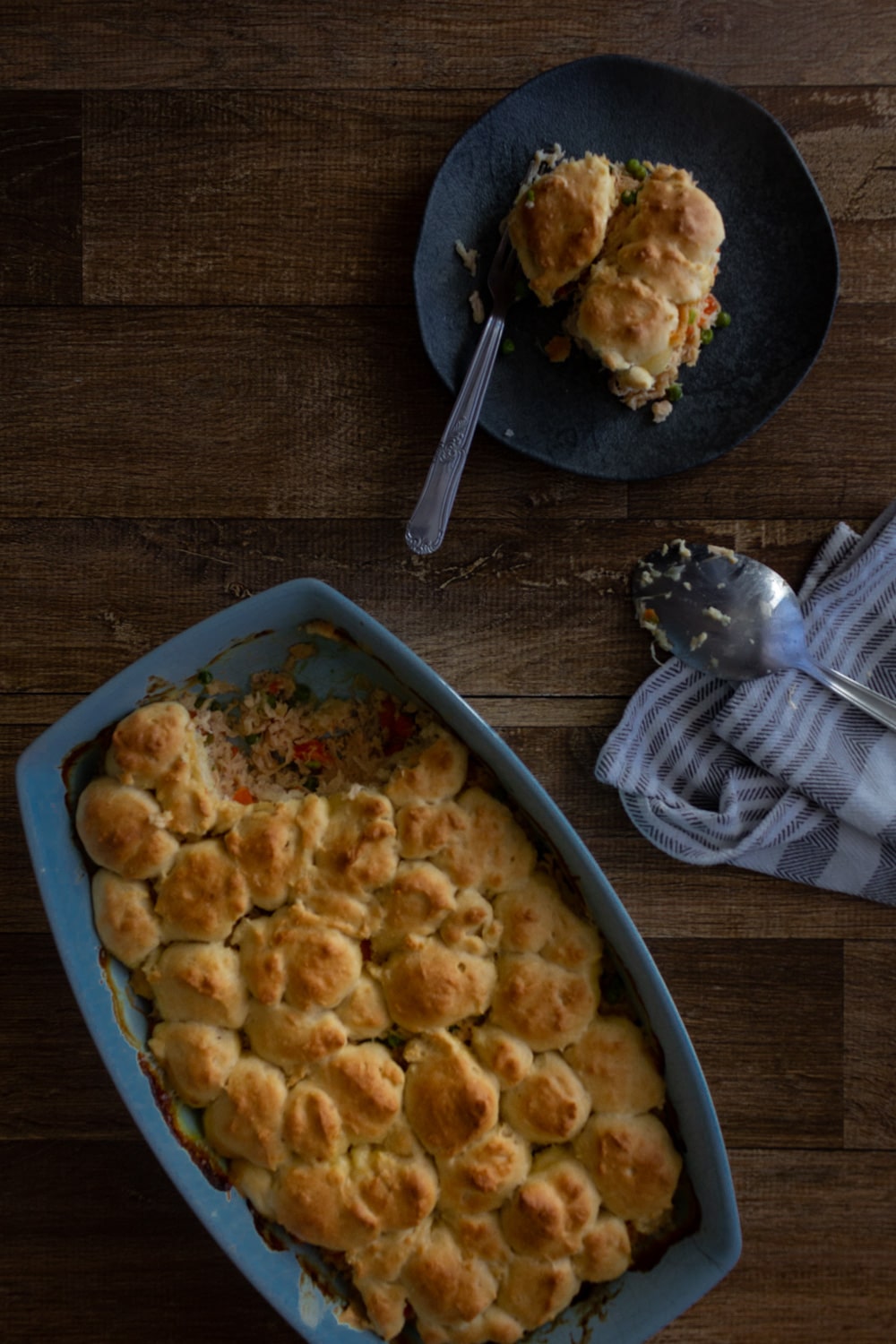 Essa diferença toda é porque esse receita é inspirada em uma pseudo torta gringa: a biscuit pot pie. As pot pies são os torta que não tem fundo, é um escondidinho cuja cobertura é massa de torta. E eu já acho essa ideia maravilhosa e indico que você experimente. Já o biscuit é um primo do scone, meio biscoito meio bolo meio pão… Fica nesse limbo sem definição em português, mas parece um pão de minuto folhado. Nada disso tem nesse escondidinho diferente, mas tudo monta o caminho que chega nele: a cobertura parece muito um pãozinho de minuto, mais até que o próprio biscuit.
