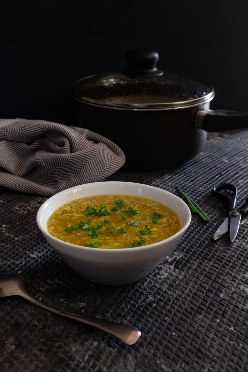 E foi essa receita do The Woks of Life que eu resolvi experimentar. É basicamente um caldo bem temperado, ligeiramente engrossado, onde a gente cozinha esses fios de ovos. E não tem muito segredo, é mais fácil de que parece comigo explicando. E claro, a técnica pode ser usada com outras bases, bem como a minha mãe faz com sopas de legumes.