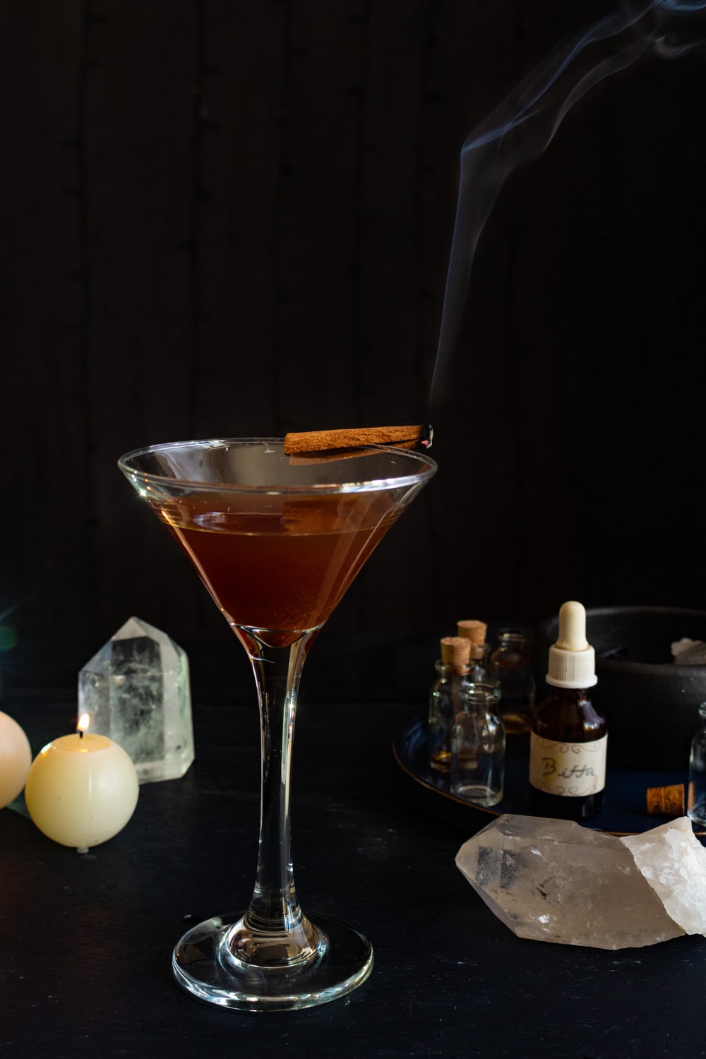 E como o xarope não tem álcool, mas o licor pedido tem, aumentei um pouco a dose de cachaça. Apenas a quantidade pedida de licor. A outra mudança nessa caveira foi a apresentação. A minha ideia era cobrir o drink com uma camada a mais de cachaça e colocar fogo. Mas depois de várias tentativas sem sucesso resolvi pensar em outra apresentação que invocasse os sabores do drink. O resultado é um pedaço de canela pegando fogo. A fumaça suave que sai dela intensifica o aroma do drink e ainda dá um toque diferente.