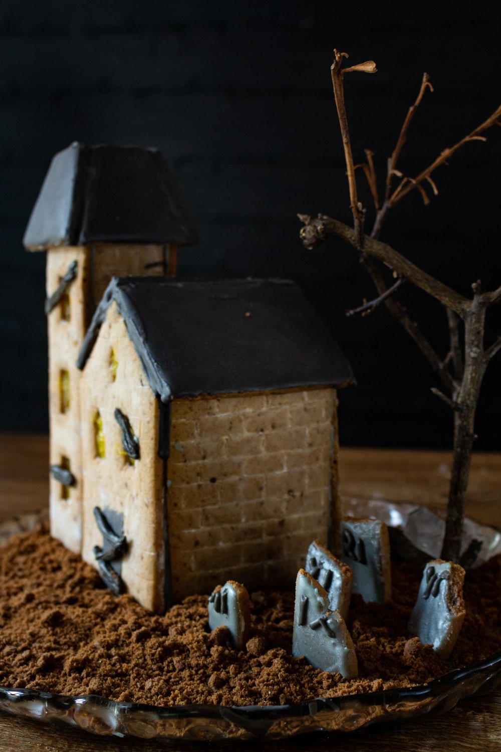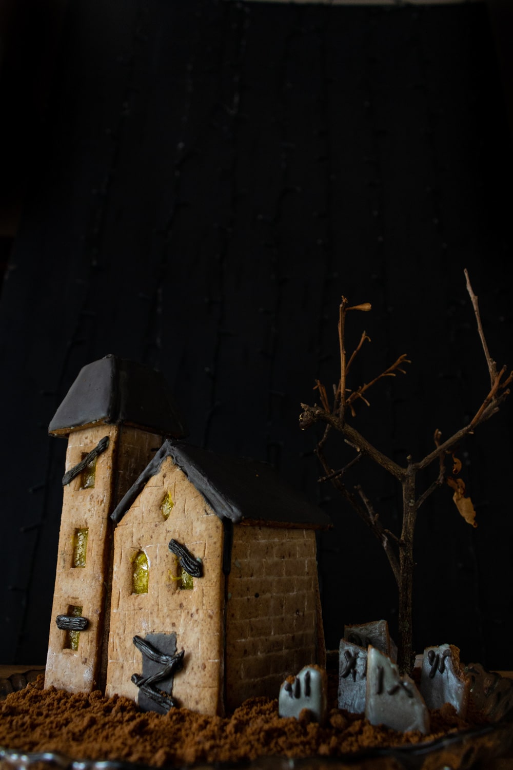 Espalhe o glacê que sobrar em volta da casa, finque as tumbas e cubra com o biscoito triturado como se fosse terra. Se quiser, um galho seco pode virar uma árvore para compor o cenário.