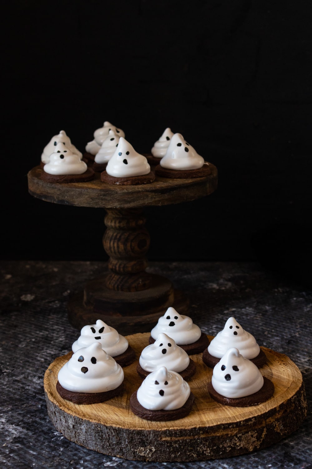 Transfira o marshmallow para um saco de confeiteiro com ponta larga, não precisa de nenhum bico. Para montar os fantasmas nos biscoitos primeiro forme uma gota de marshmallow em cima de um biscoito; antes de tirar o bico fazendo a pontinha da gota, afunde um pouquinho o saco de confeiteiro no marshmallow que já está no biscoito e faça uma segunda gota em cima da primeira (que vai estar “amassada”). Você pode parar por aí ou fazer uma terceira camada.