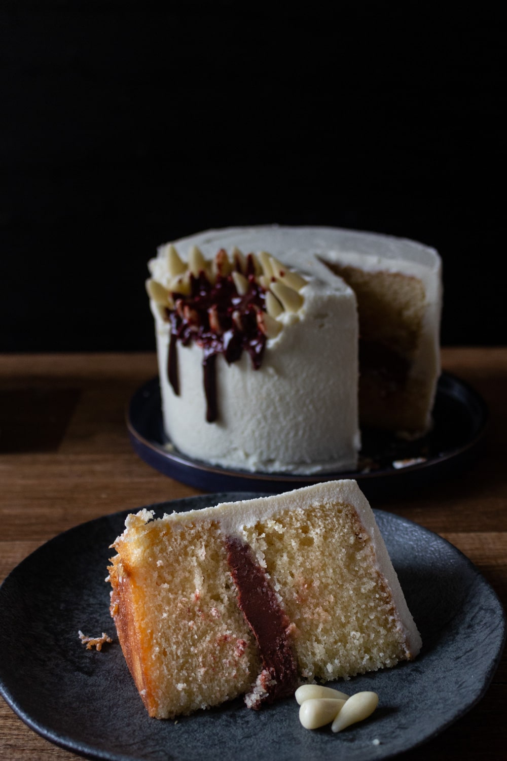 Corte os topos dos bolos para que fiquem retos e da mesma altura. Retire também as laterais caso estejam esfarelando muito. Molhe os bolos com a calda. Reserve cerca de 2 colheres da ganache e use o restante para espalhar sobre o topo de um dos bolos. Alise bem e vira o outro bolo, de cabeça pra baixo, sobre a ganache. Leve o bolo para o congelador por 30min.