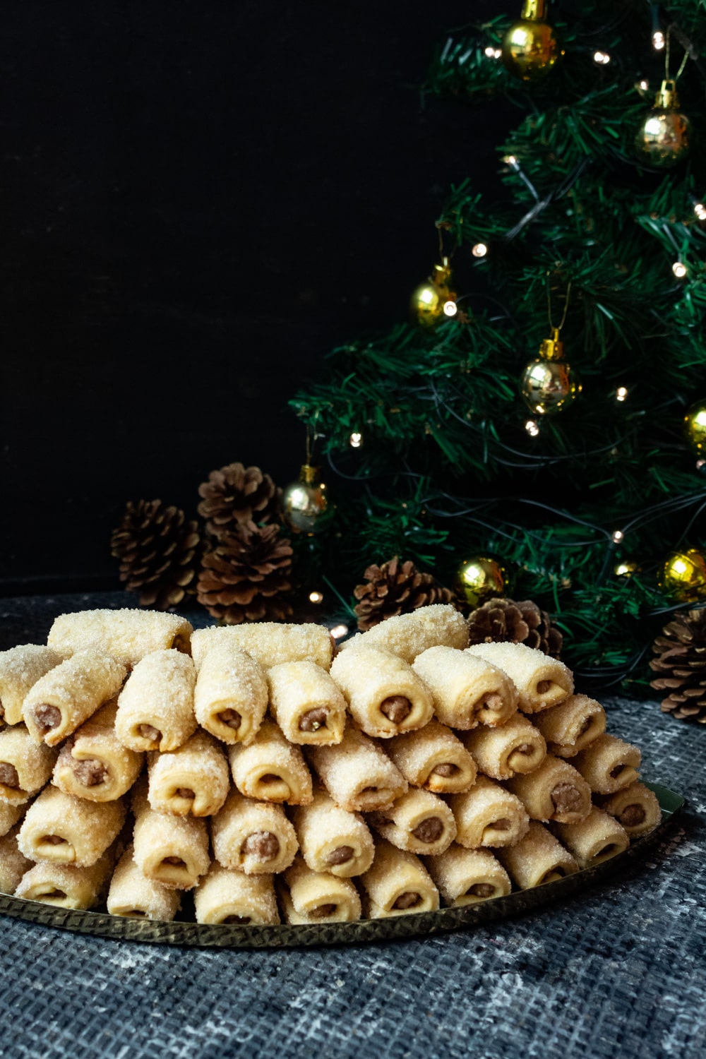 Retire a massa da geladeira e divida em 4 partes. Mantenha 3 na vasilha tampada, de volta na geladeira, e transfira a outra para uma bancada levemente enfarinhada. Abra a massa até ela ficar com 2-3mm de espessura. Corte quadrados de 5x5cm. Guarde as aparas de massa de volta na vasilha na geladeira. Coloque 1/2 colher do recheio no centro de cada quadrado de massa. E enrole todos eles formando caninhos recheados com nozes. Role cada caninho de massa na bancada para selar bem a parte onde as pontas de massa de encontram.* Passe cada um na clara batida, retire o excesso de clara e passe no açúcar cristal. Então espalhe-os sobre uma assadeira com papel manteiga deixando 1cm de distancia entre eles. Repita o processo com o restante da massa e do recheio, deixando as aparas de massa pra trabalhar por último.