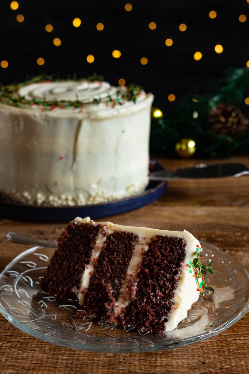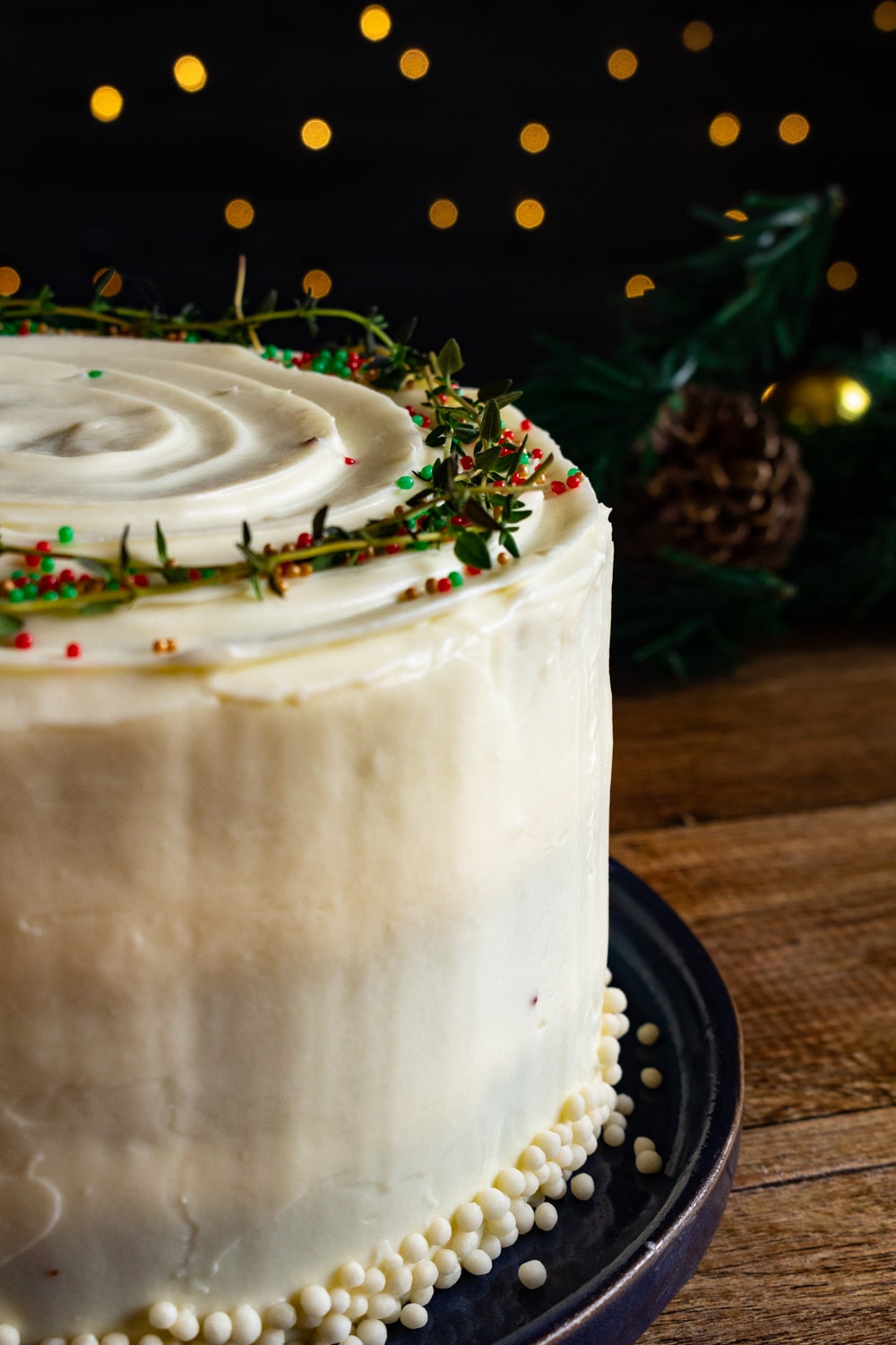 Para deixar esse red velvet com cara de natal coloque ramos de tomilho no entorno do topo do bolo formando uma guirlanda. Cubra a base da lateral com confeitos brancos e finalize com algumas miçangas verdes, vermelhas e douradas junto do tomilho.