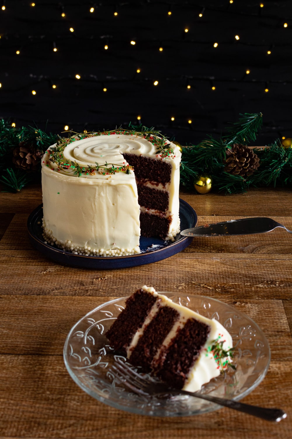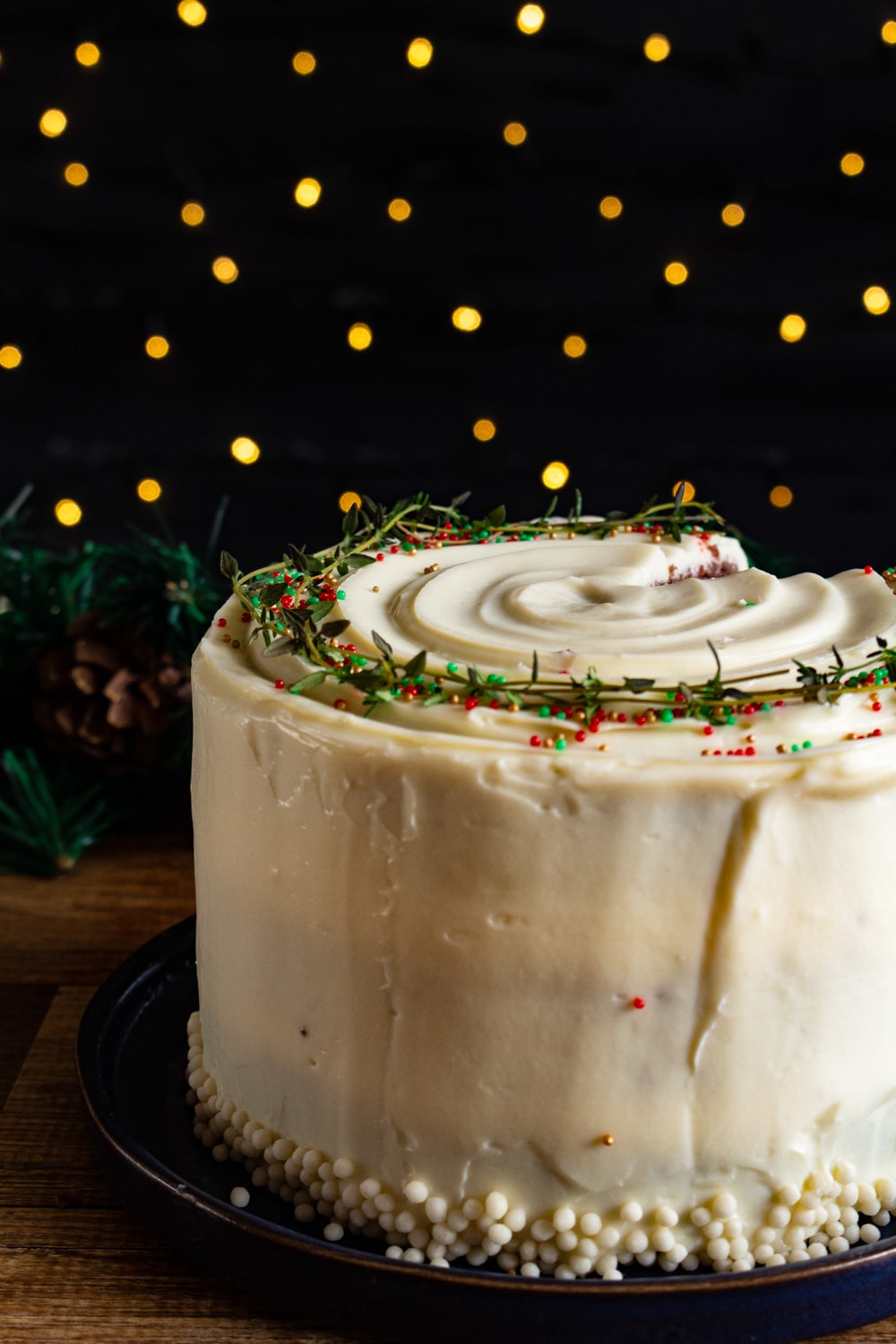 Eu escolhi o red velvet porque já tinha muito tempo que queria fazer um pro natal, mas a verdade é que esse tipo de decoração vai servir pra qualquer bolo que você escolha fazer. O tomilho pode pode virar qualquer outra erva delicada e que seja comestível claro. E as miçangas de açúcar podem ser bem pequeninas como as que eu usei, pra quase sumirem no meio do tomilho… Ou podem ser um pouco maiores pra aparecerem mais.