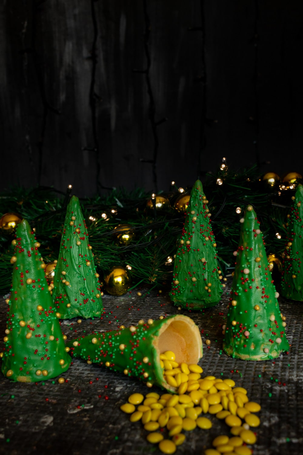 Nessa linha de pensamento eu recheei os cones com confetes de chocolate (mm’s genéricos) primeiro porque queria os cones recheados com algum tipo de bala e não com um creme/doce que enchesse o cone todo. Mas também foram confetes amarelos porque era esse o que eu tinha aqui. E não, eu não ia sair só pra comprar balas verde e vermelhas sendo que eu tinha um pacote perfeitamente comestível aqui em casa. É claro que você pode fazer adaptações como essas ou comprar tudo pra fazer do jeitinho que você imaginou. Cada realidade vai pedir uma atitude diferente.