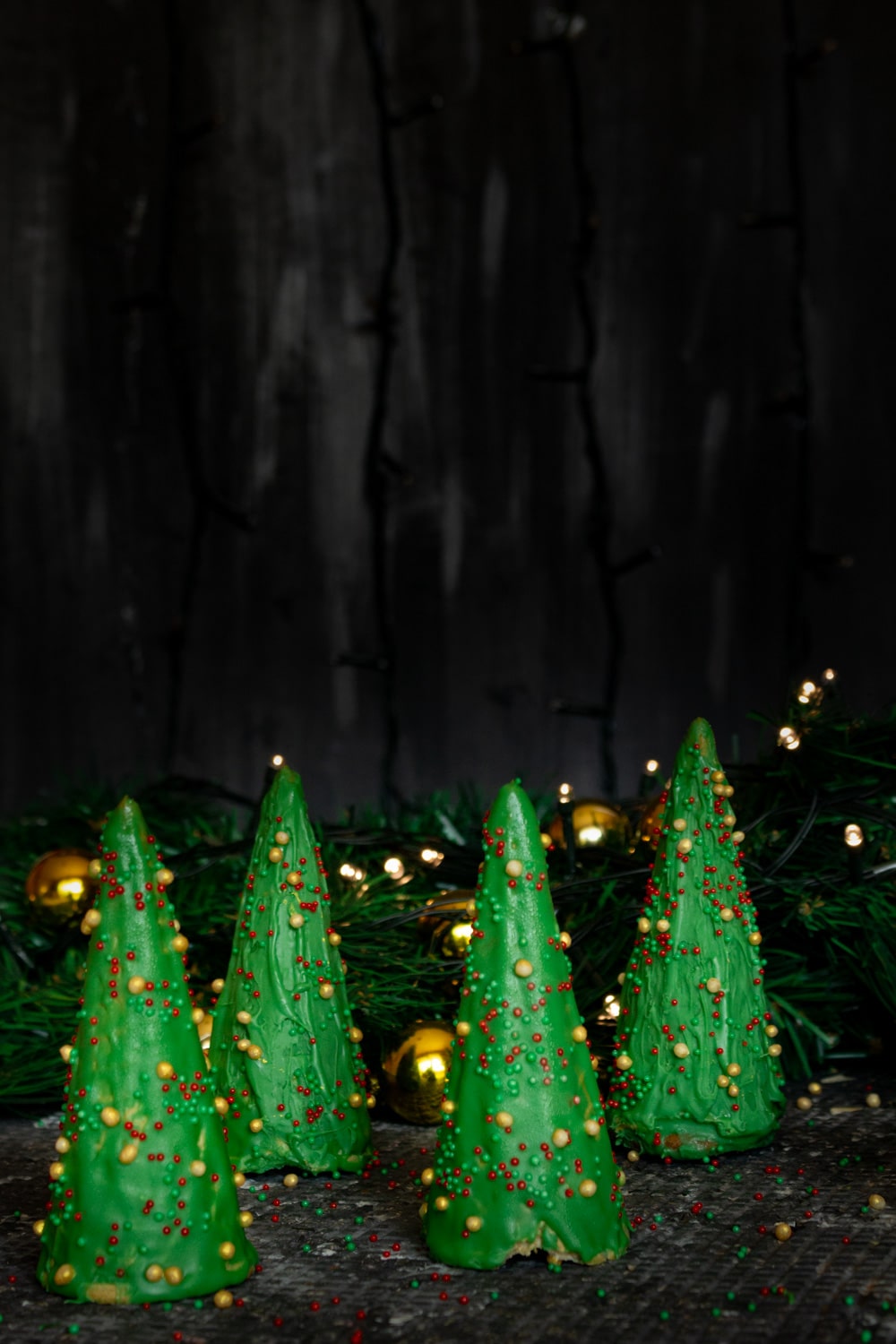Derreta o chocolate junto do corante e, se for manter os cones fora da geladeira que é o comum, tempere. Pra mais detalhes sobre temperagem vide o texto acima. Cubra as casquinhas com o chocolate e antes que ele seque espalhe os confeitos por toda a casquinha, formando os enfeites da árvore. Deixe o chocolate secar bem antes de continuar a montar os cones recheados.