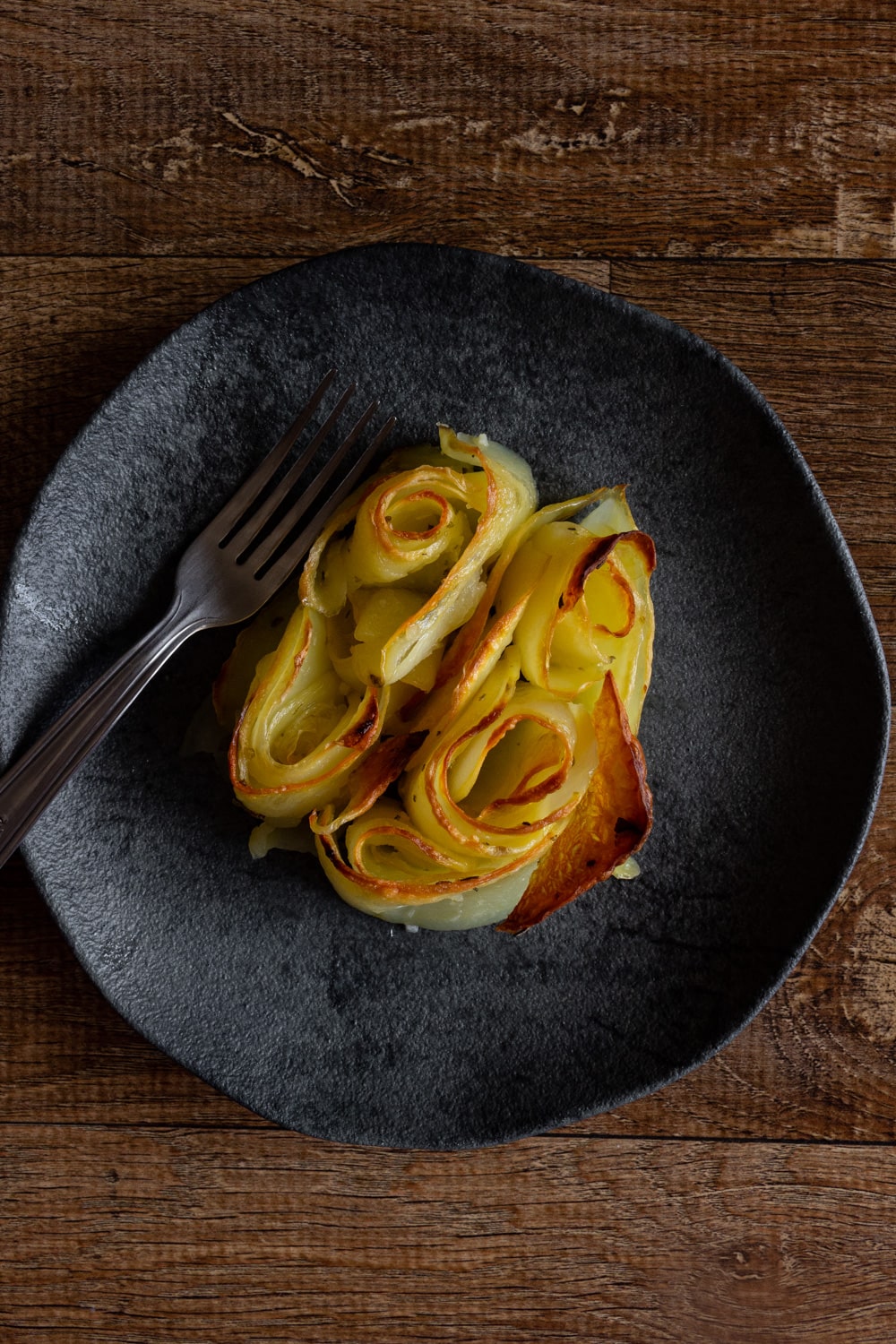 Batatas assadas em fitas pra conseguir um prato bonito e com duas texturas diferentes! E com opção vegana ou não pra escolher o que você preferir.