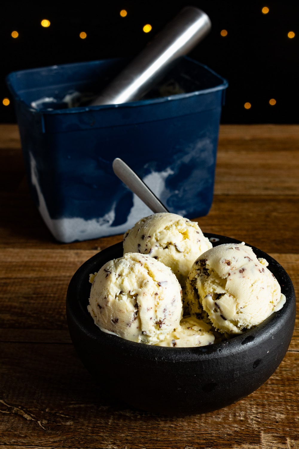 Derreta o chocolate e quando o sorvete estiver firme continue batendo e vá adicionando o chocolate num fio contínuo. Quando mais fino esse fio menores os pedaços de chocolate no sorvete. Quando todo o chocolate estiver no sorvete pare de bater e transfira tudo para uma vasilha com tampa. Leve para o congelador por 6h ou de um dia pro outro antes de servir.
