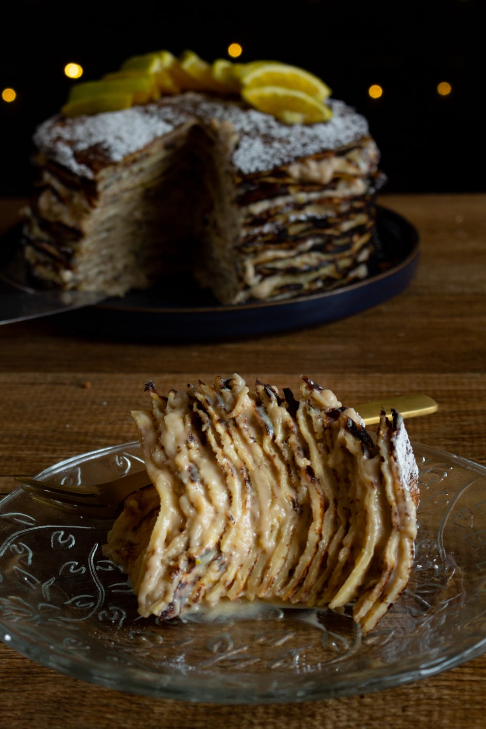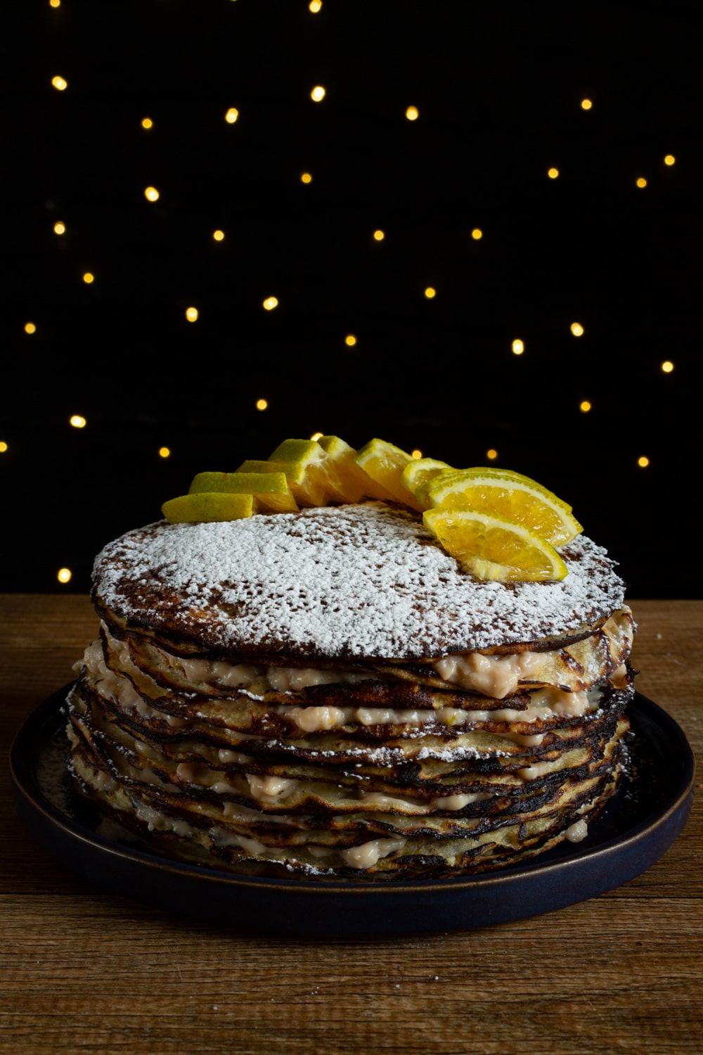 Para montar o bolo centralize um crepe no prato e cubra com uma colherada do creme frio. Vá empilhando crepes cobertos com creme. É mais fácil cobrir o crepe com o creme em um prato e então empilhar sobre os outros. O último crepe é colocado sem creme e então leve o bolo para gelar por alguma horas. Logo antes de servir polvilhe um pouco de açúcar de confeiteiro e enfeite com fatias de laranja.