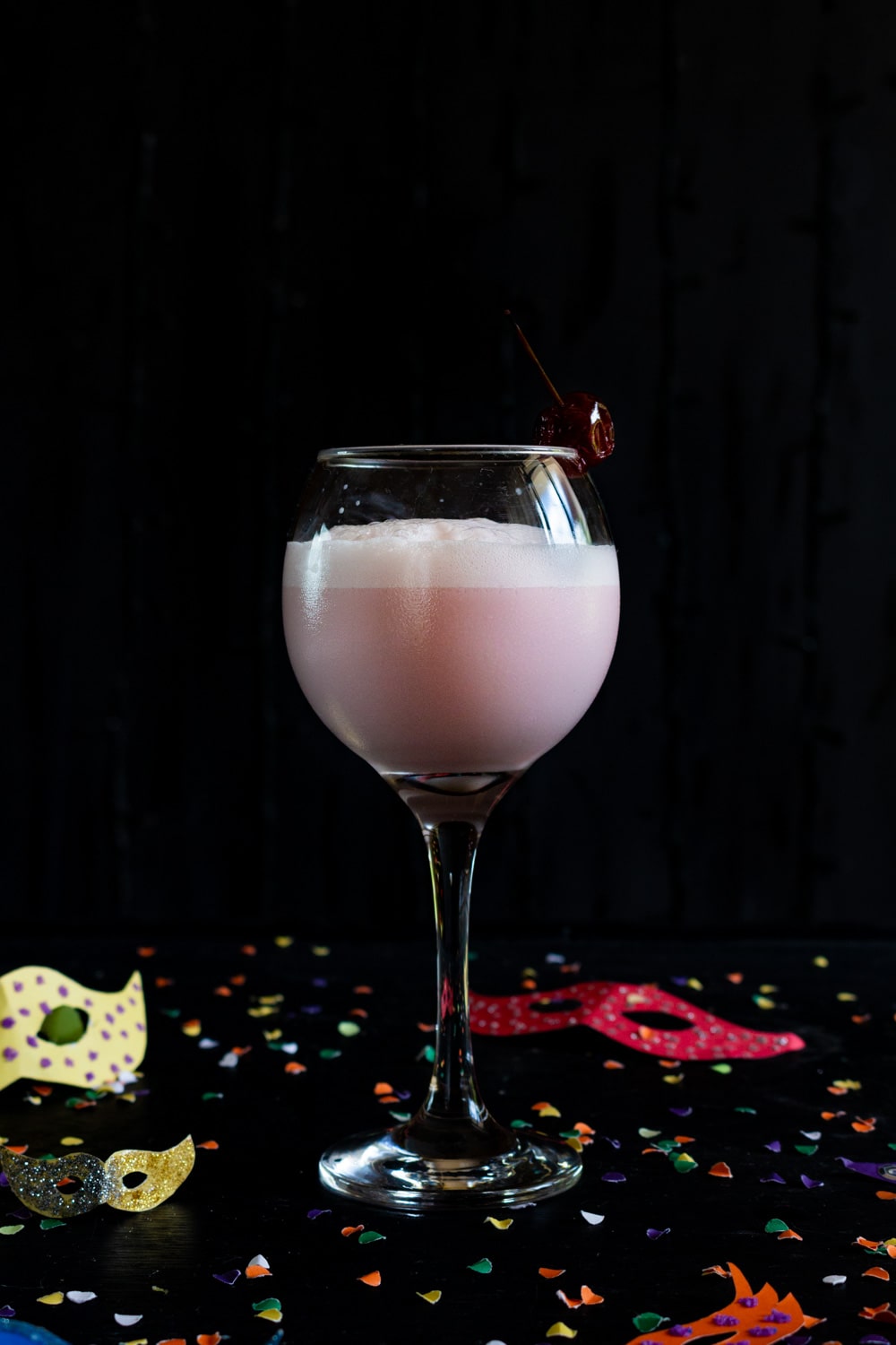 Bata tudo em uma coqueteleira com gelo; coe em uma taça e sirva com uma cereja.