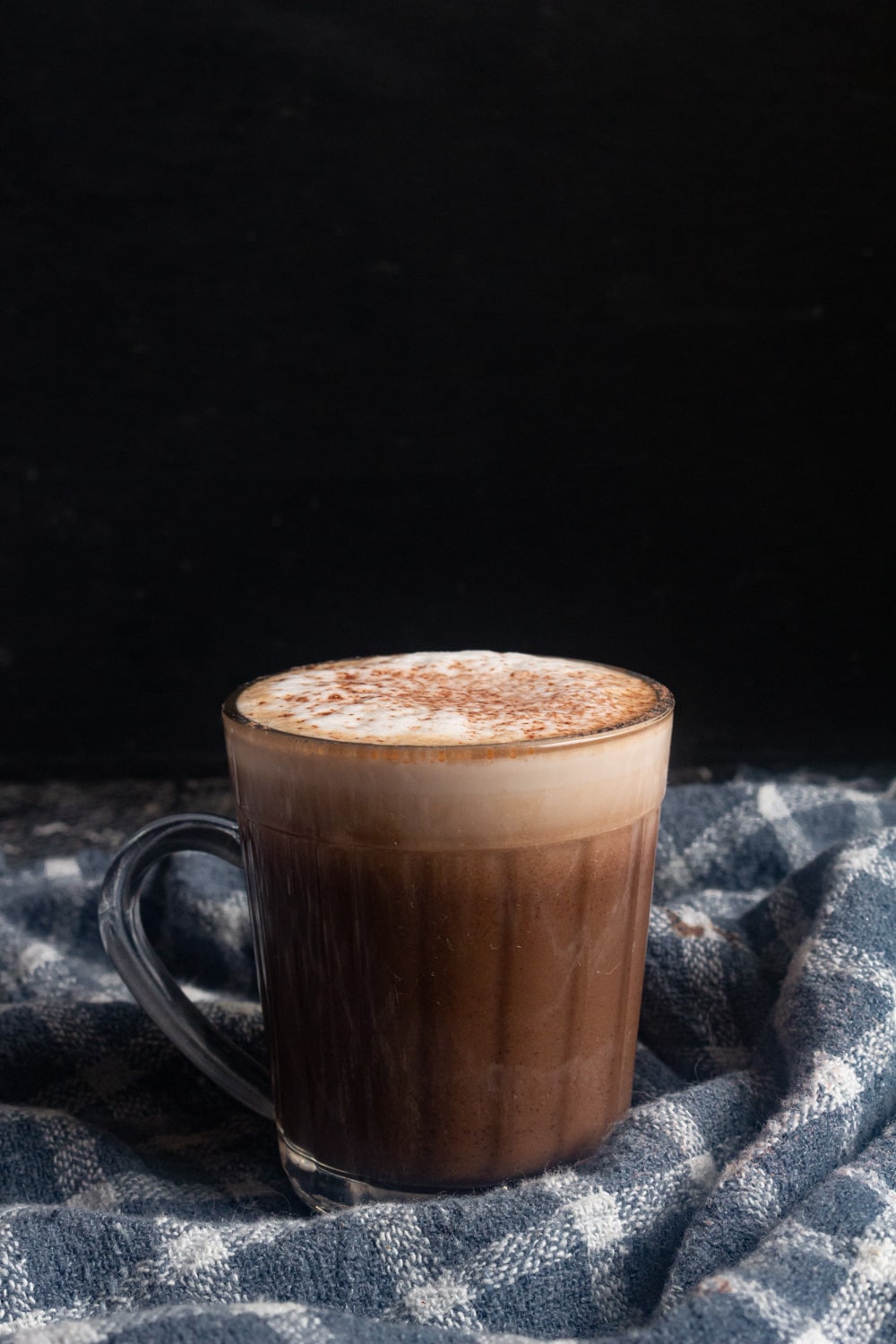 Pra finalizar sem o clássico chantilly em cima escolhi leite vaporizado, que é aquele que forma uma espuma no topo. Aqui eu fiz na cafeteira, mas tem jeitos fáceis de fazer em casa. Existem alguns apetrechos específicos que dá pra comprar pela internet e que parecem um mini fouet. Também dá pra fazer numa prensa francesa se você tiver em casa. E se não tiver nada específico também dá:
