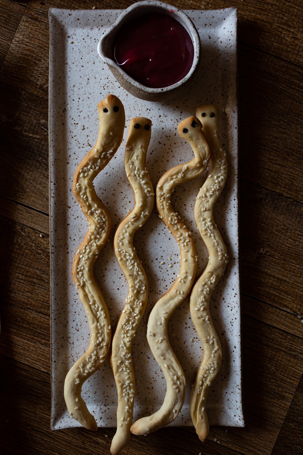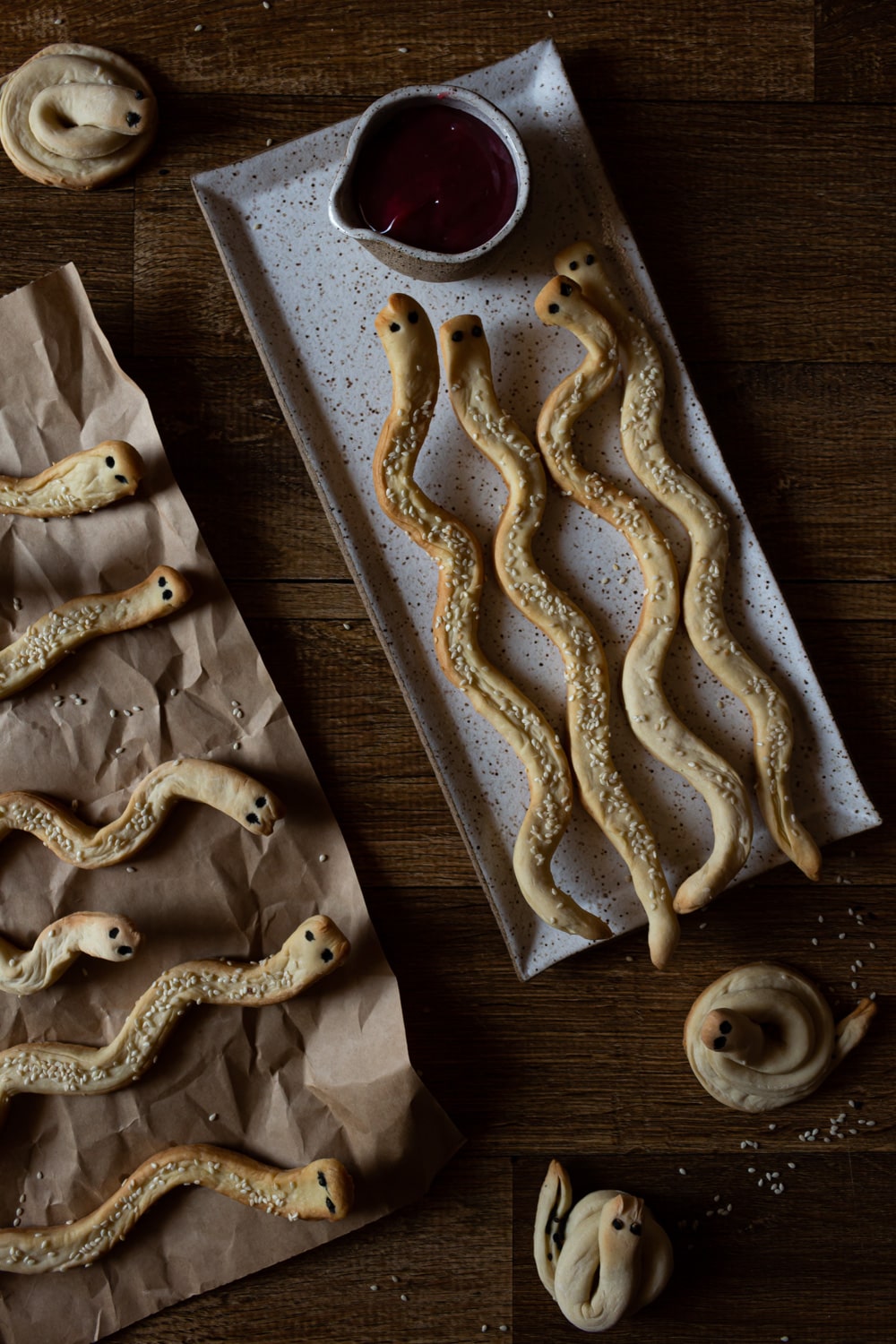 - Transfira as cobras para assadeiras untadas, modelando pra que elas façam curvas com o corpo. Se quiser enrole algumas, como cascáveis fazem. Pincele todas com a clara, ou o azeite, e cubra o corpo com gergelim e coloque duas sementes de coentro na cabeça pra fazer os olhos.