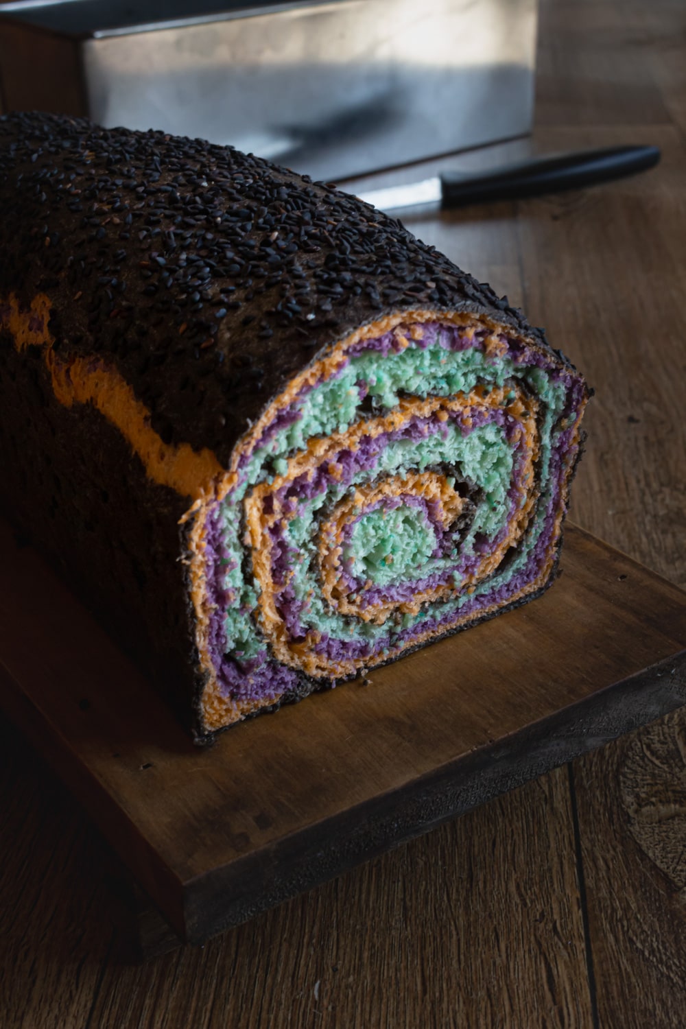 Espiral de Halloween num pão de forma colorido mas ainda assim meio macabro e meio assustador, e bem simples de fazer.