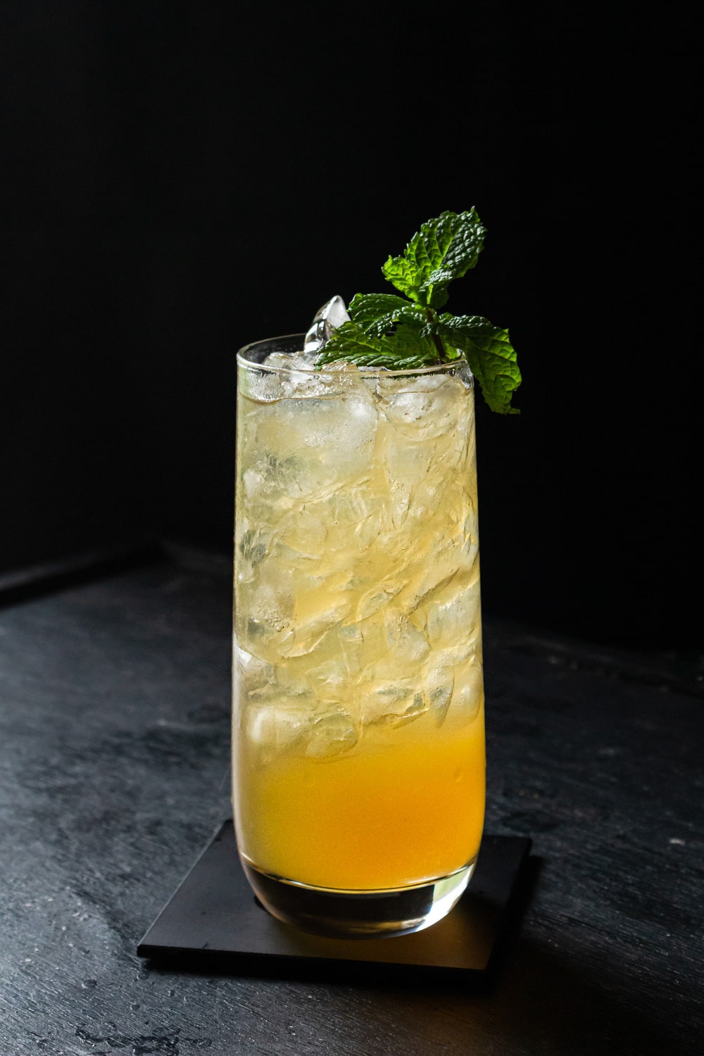 - Em um copo alto junte todas as bebidas. Termine de preencher o copo com o gelo picado. Sirva com o ramo de hortelã para perfumar mais.