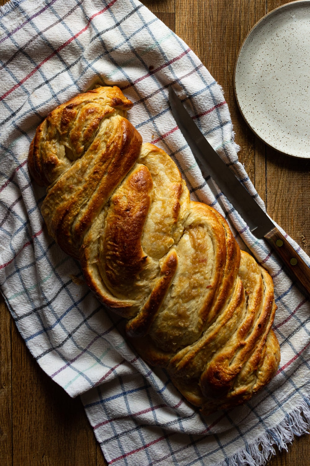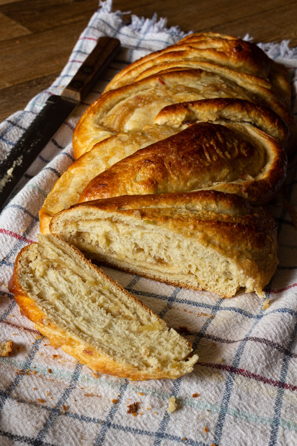 Trança de maçã, feita com uma massa de pão doce que lembra um brioche, e com um recheio que parece de torta de maçã!