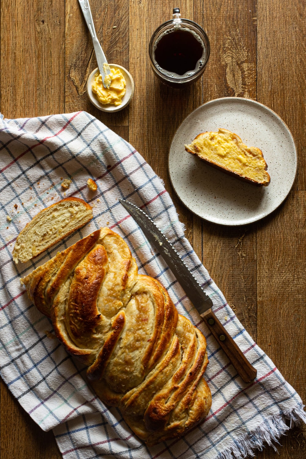 Por último, uma mudança mais estrutural, por assim dizer. A única forma que eu tenho, e que é grande o bastante pra essa receita, é bem alta. Isso quer dizer que colocar o pão trançado dentro dela é bem difícil. Então eu preferi assar num tabuleiro, já que eu poderia trançar o pão já dentro dele. Principalmente pro vídeo fica bem mais fácil mostrar. Mas isso quer dizer que o pão vai crescer livremente, se espalhando pros lados também. Se você preferir um pão mais alto, e com as curvas mais bem definidas, é só assar numa forma retangular.