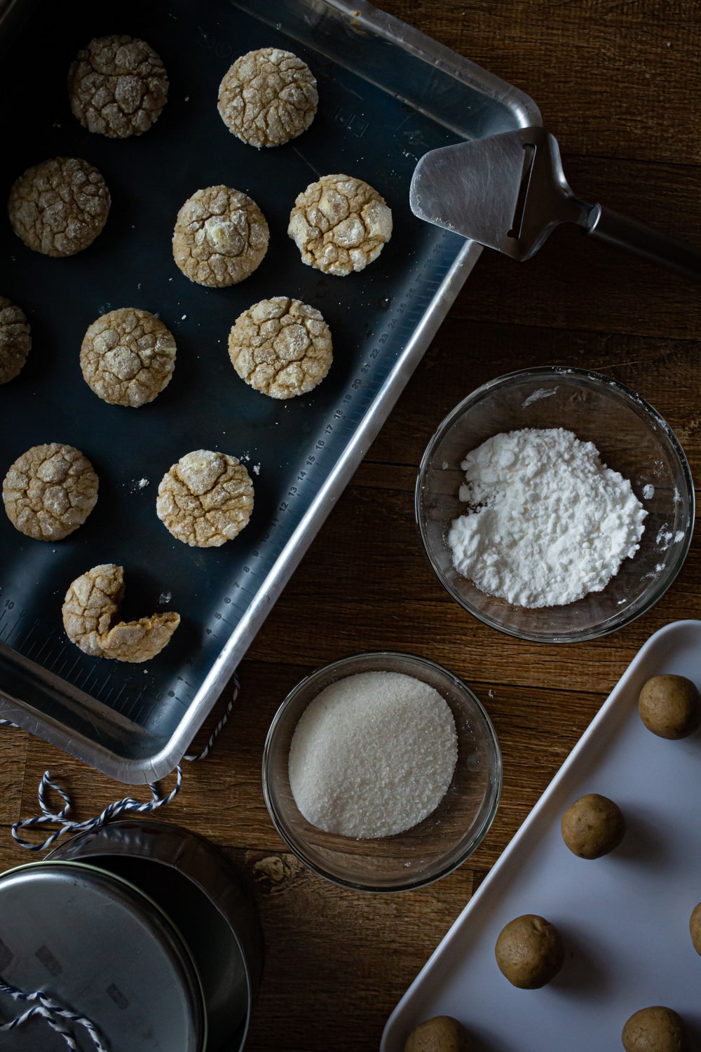 Por último, um detalhe da cobertura que faz os biscoitos ficarem craquelados. Essa receita, originalmente, e muitas outras indicam passar as bolinhas de massa no açúcar de confeiteiro antes de assar. Eu sempre faço uma cobertura dupla, primeiro no açúcar cristal e depois no açúcar de confeiteiro. Pra mostrar a diferença eu fiz dos dois jeitos no vídeo desse post. A cobertura simples dá um craquelado mais sutil e a cobertura dupla dá um craquelado mais intenso. Na receita abaixo eu deixei o jeito que gosto mais e que aparece mais nas fotos. Mas você pode conferir a comparação no vídeo e escolher como prefere fazer.