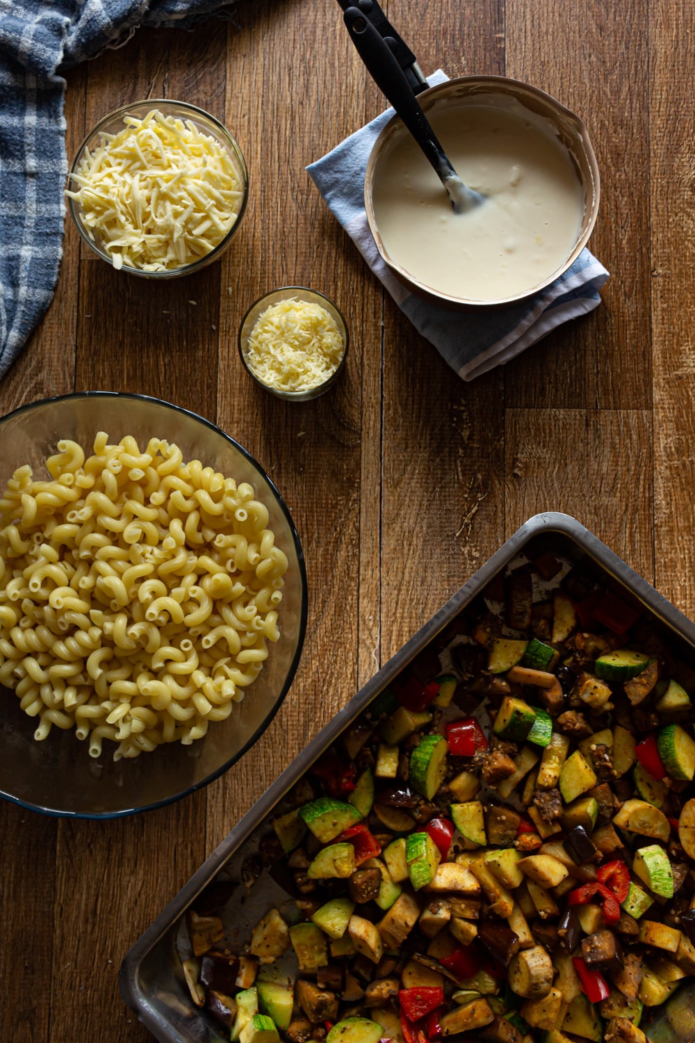 - Misture os legumes assados com o macarrão e 2/3 do molho e a mussarela. Ajeite na travessa em que for servir. Cubra com o restante do molho e, por cima, o parmesão. Leve ao forno a 300C apenas para dourar o queijo.