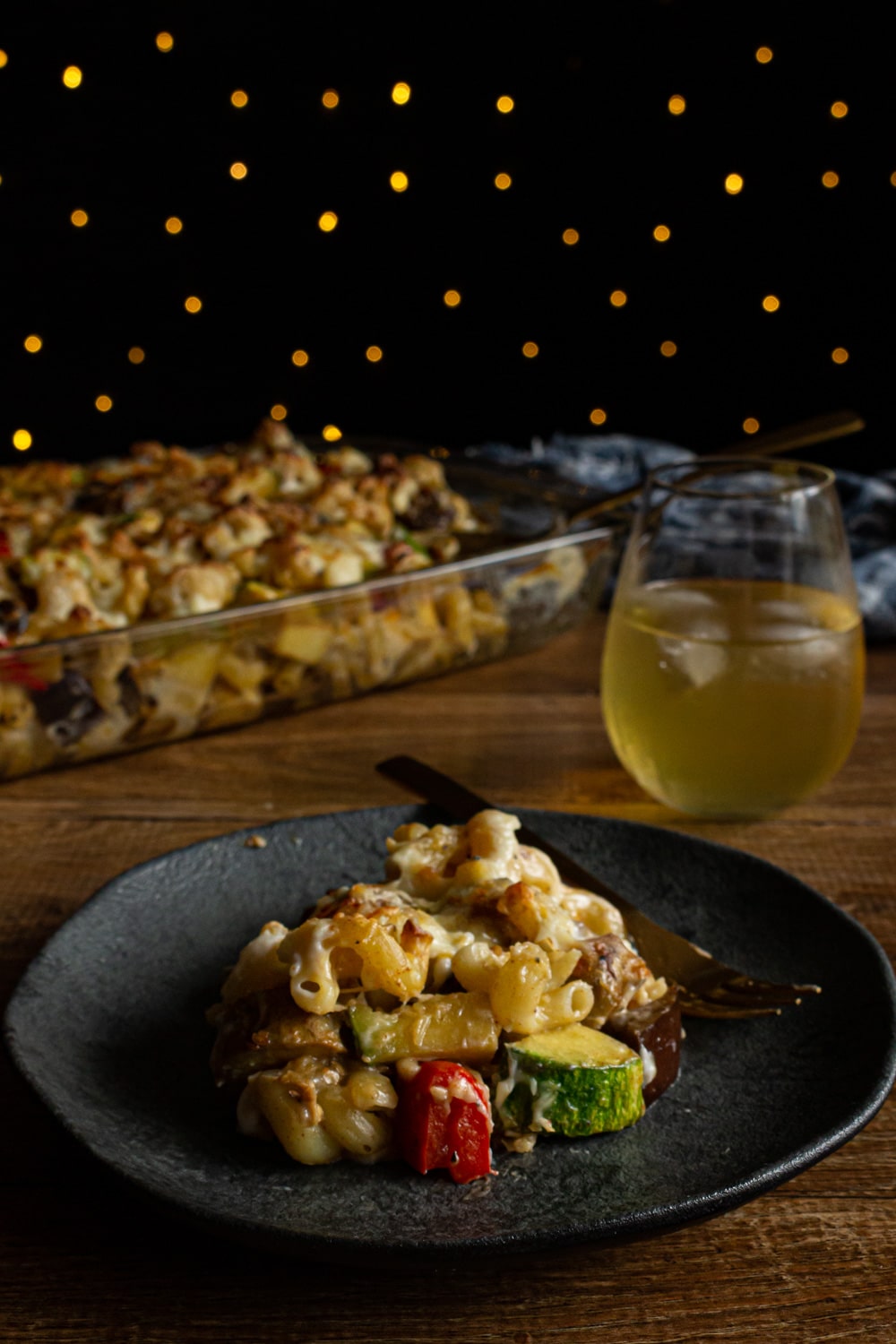 Macarrão com legumes assados, tudo misturado com molho branco e queijo, e gratinado, pra um almoço sem carne mas delicioso!