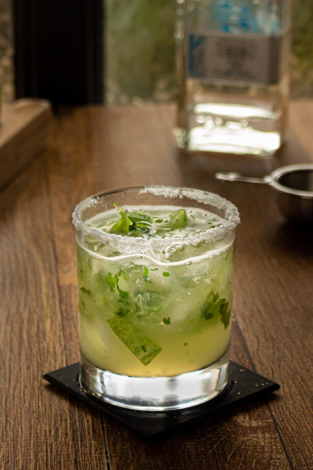 Margarita de Pepino, com bastante hortelã pra garantir a sensação refrescante e servida num copo baixo pra facilitar a vida.