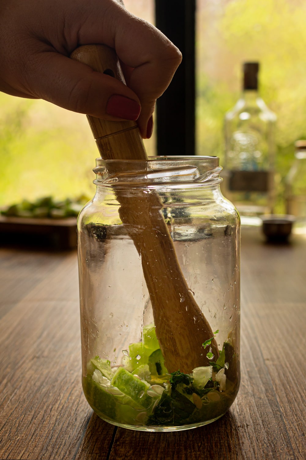 - Em um pote amasse os pedaços de pepino com as folhas de hortelã. Acrescente os demais ingredientes e chacoalhe bem.