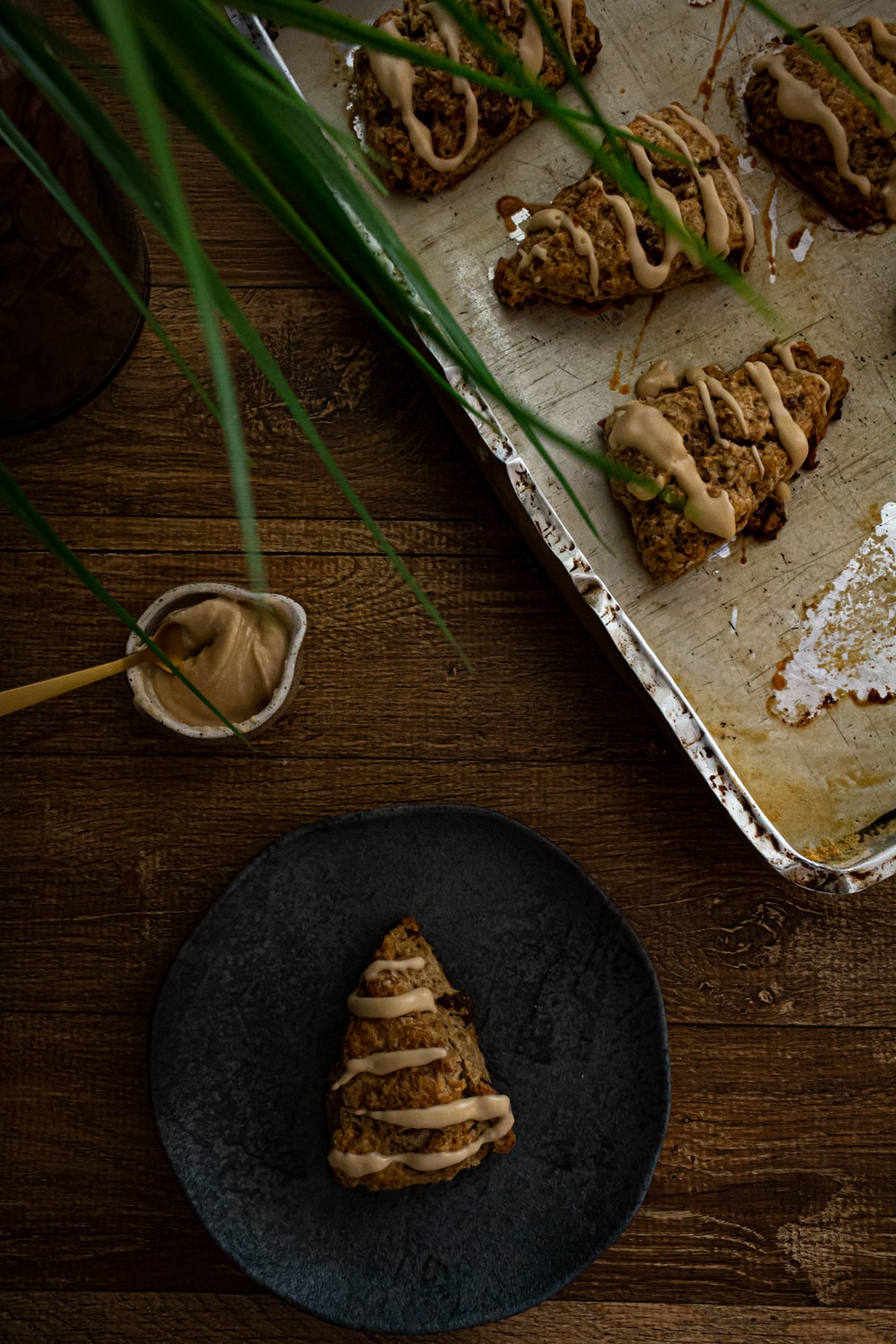 Por fim, a cobertura. A original era mais complexa e envolvia xarope de bordo e levar açúcar de confeiteiro ao fogo. Eu sempre tenho dificuldade cozinhando açúcar de confeiteiro… Então simplifiquei e apenas misturei o açúcar com mais café. Ficou bem leve, combinando muito com os scones. Mas claro que ela é opcional e, mesmo sem ela, eles continuam gostosos.