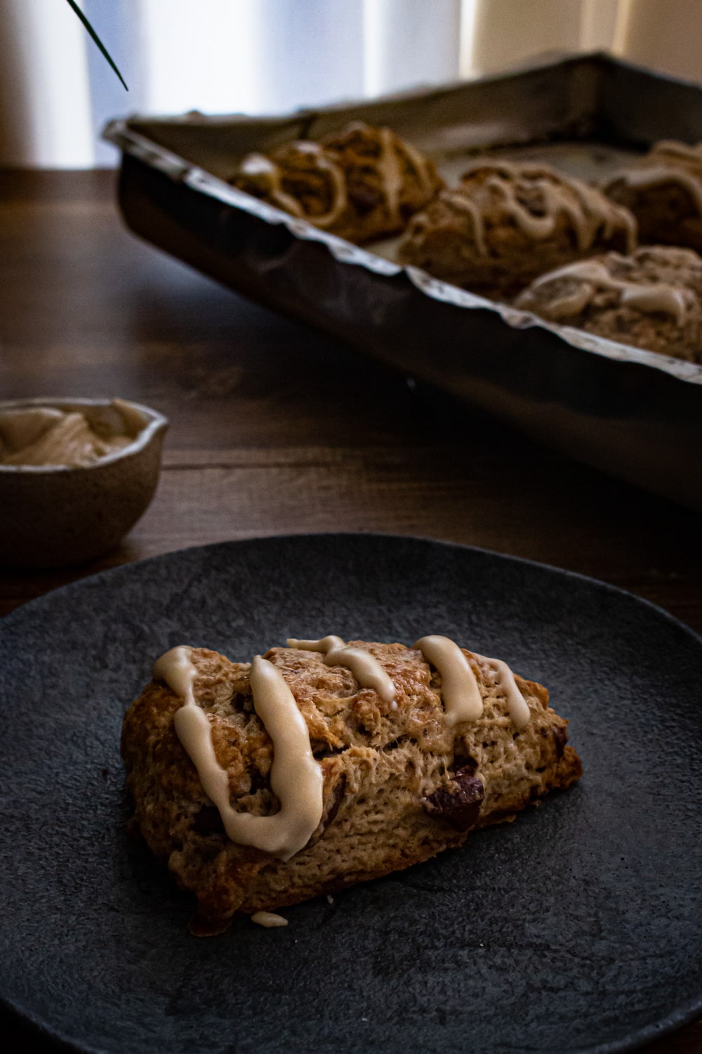 Scones de café, com sabor de café mesmo, e pedaços de chocolate meio amargo misturados na massa, e com cobertura de café bem docinha!