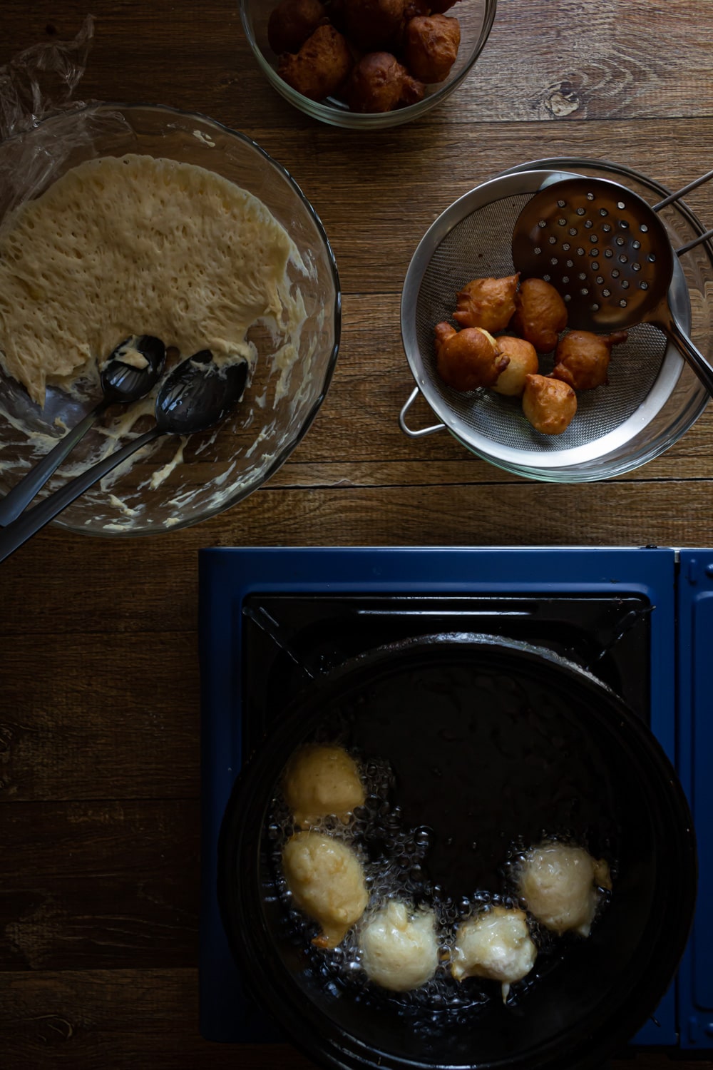 - Esquente uma panela com cerca de 3 dedos de óleo. Quando o óleo estiver quente frite colheradas de massa, pingadas no óleo. Você pode untar a colher ou manter molhada para a massa não grudar.