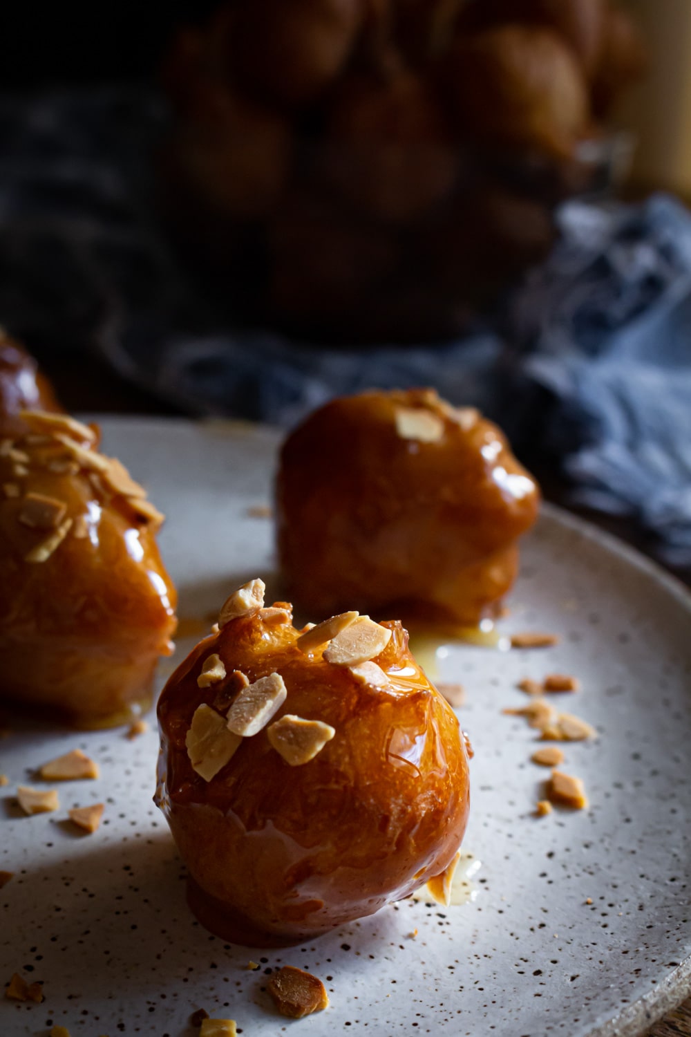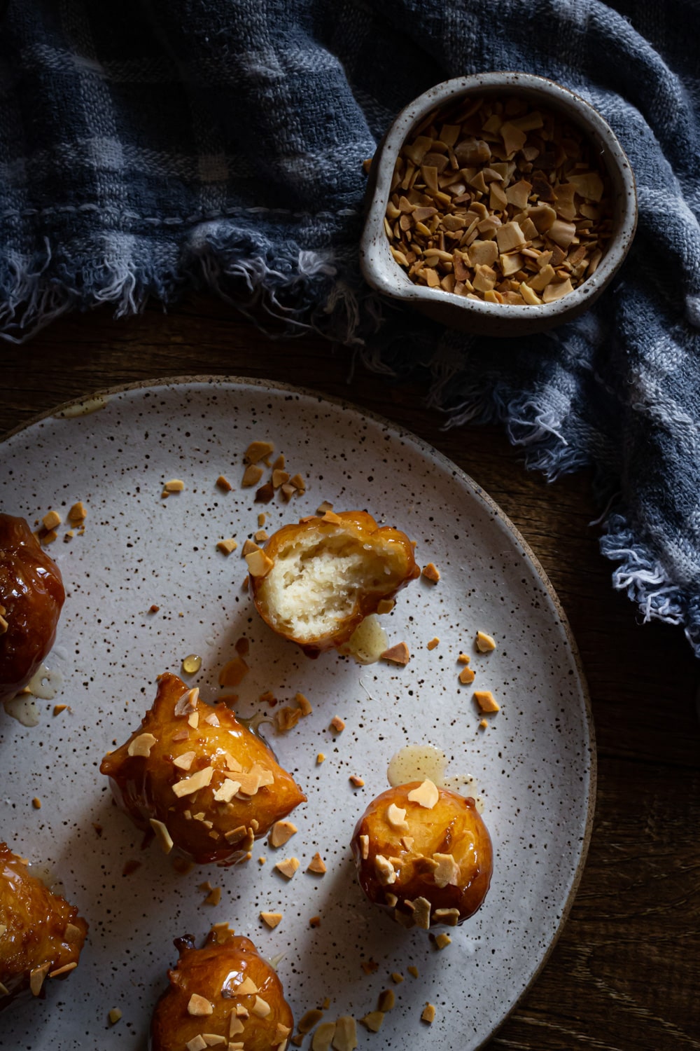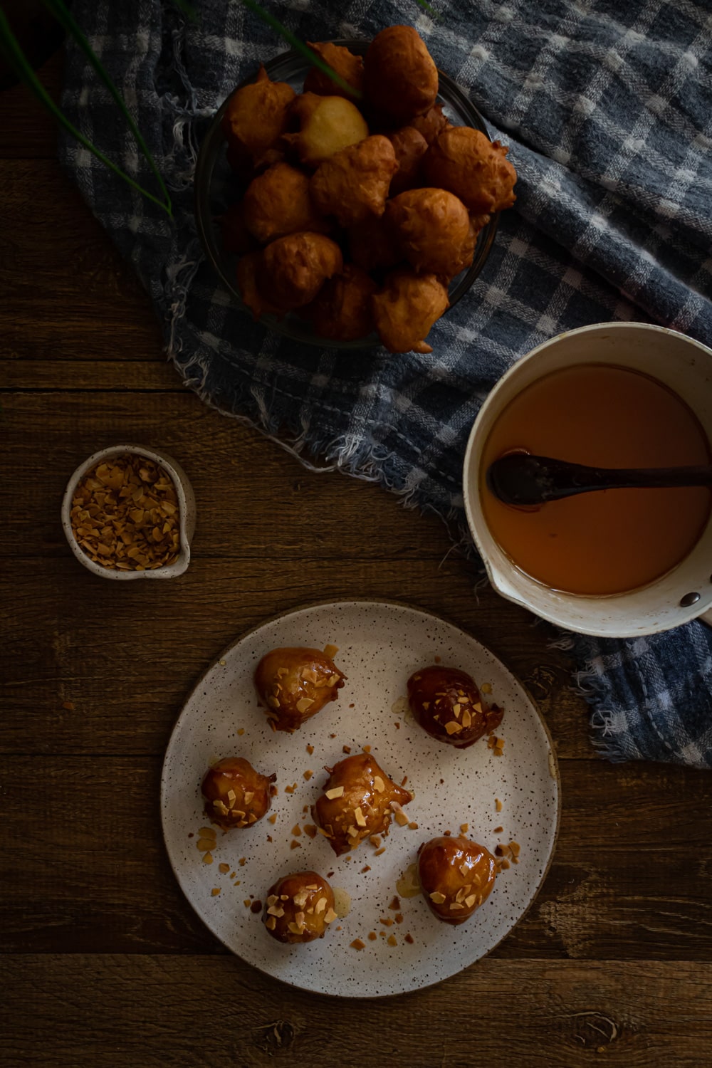 Loukomades, bolinhos de massa fermentada, fritos por imersão e depois mergulhados em calda de mel e servidos com castanhas trituradas. Tem como não ficar bom?
