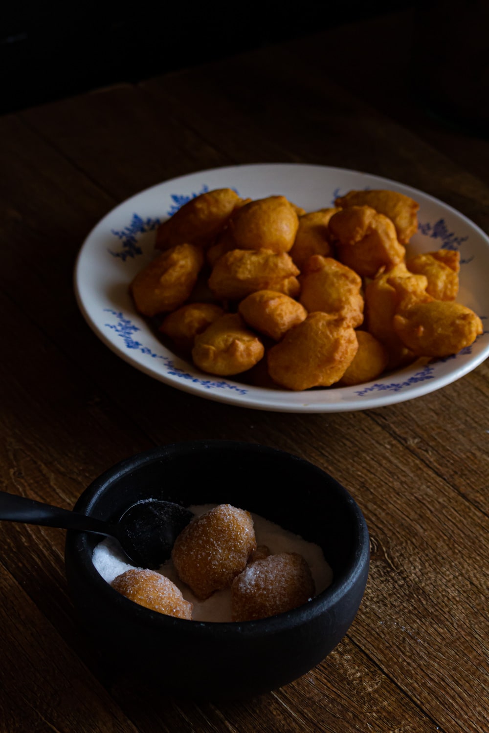 - Frite colheradas da massa em imersão em óleo quente e deixe escorrer em uma peneira de metal ou no papel toalha. Se quiser, passe os bolinhos no açúcar, ou açúcar com canela, ainda morninhos.