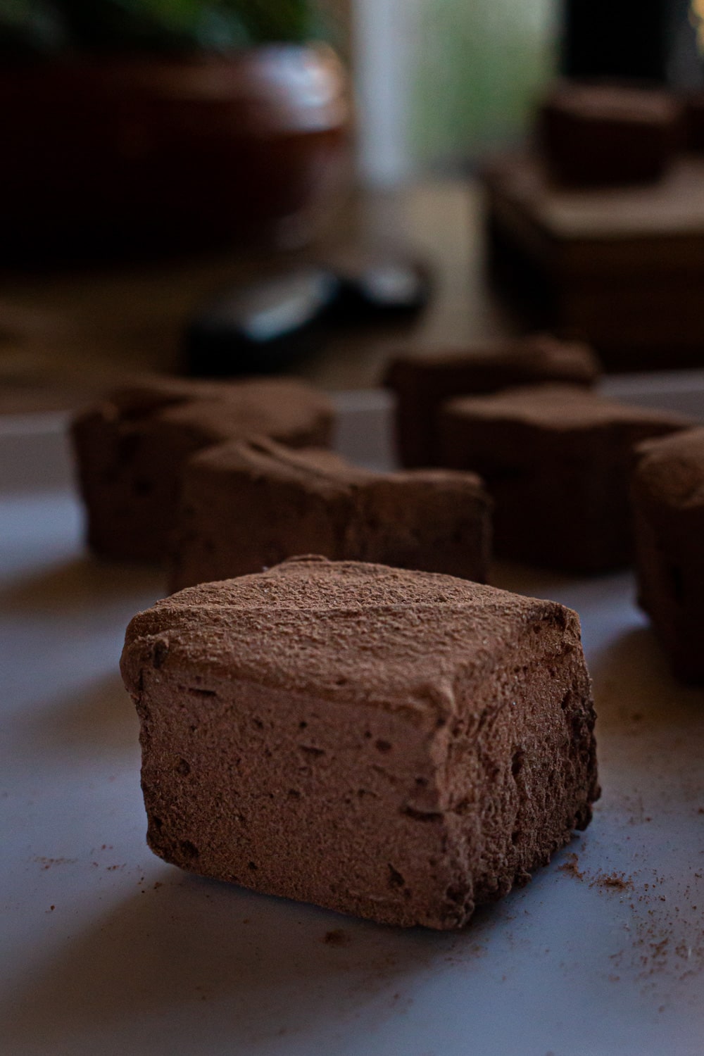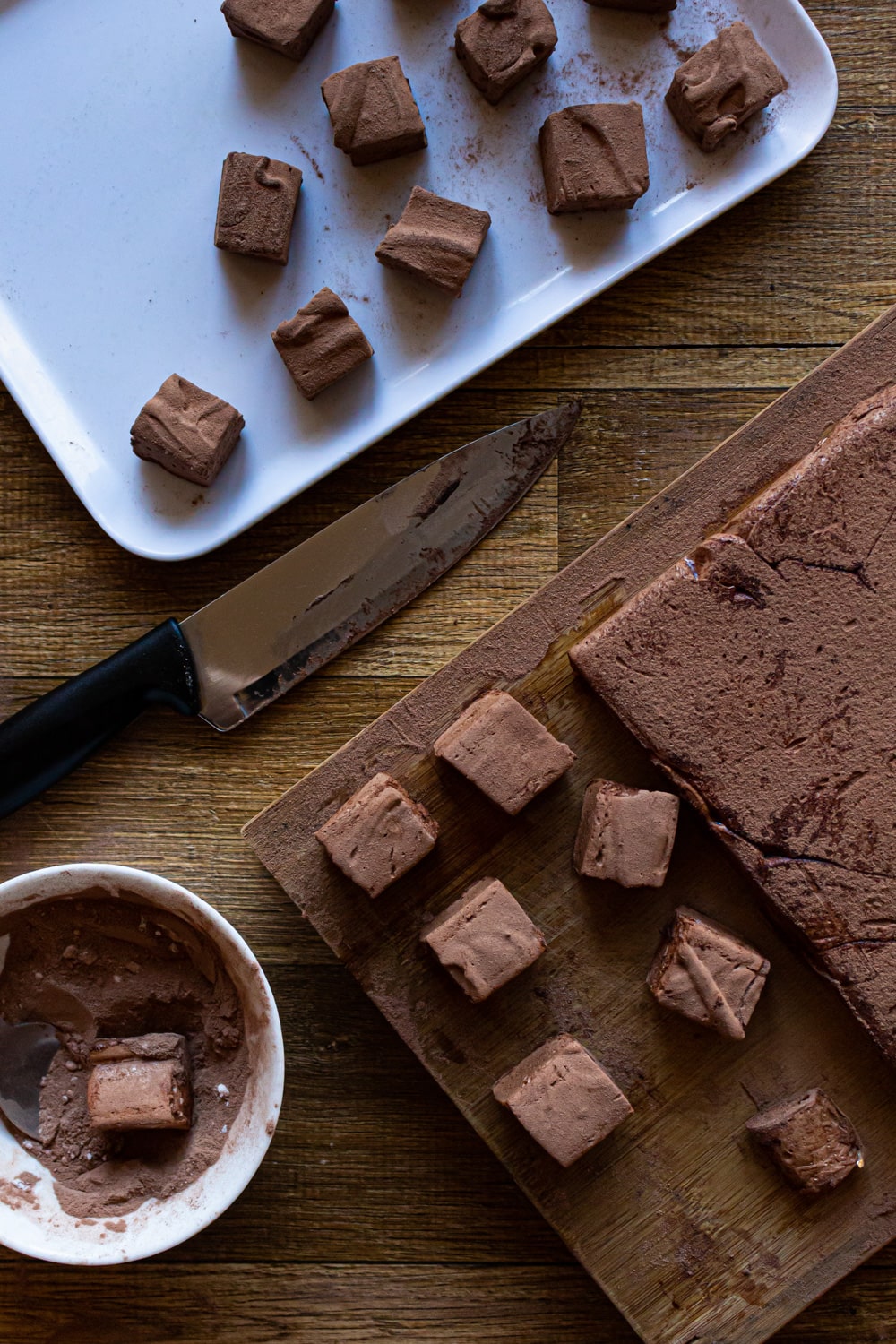 - Passadas as 8h vire o marshmallow em outra superfície e retire o papel alumínio. Cubra o outro lado com mais da mistura de açúcar e chocolate. Então corte os pedaços do tamanho que preferir e cubra todos na mesma mistura.