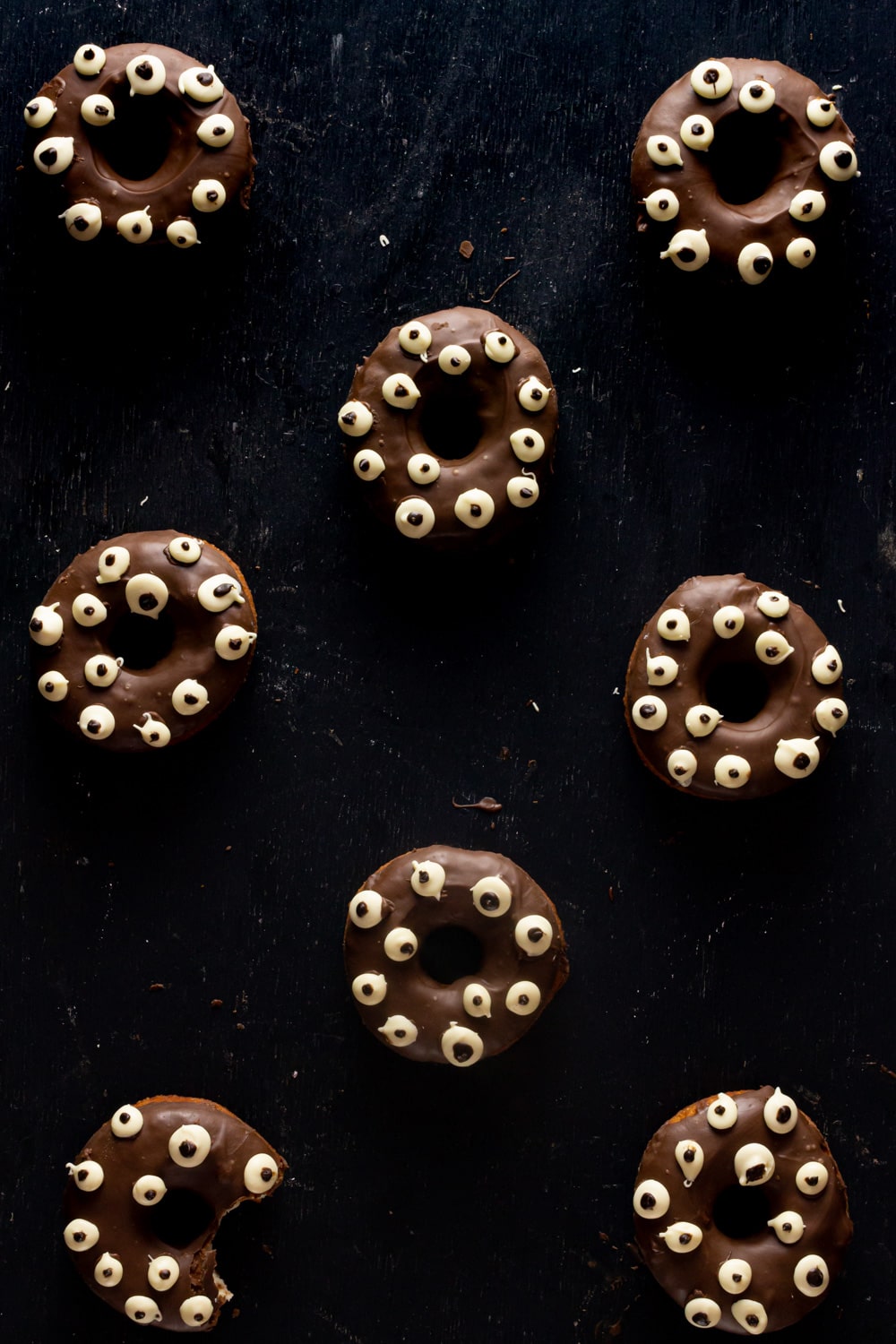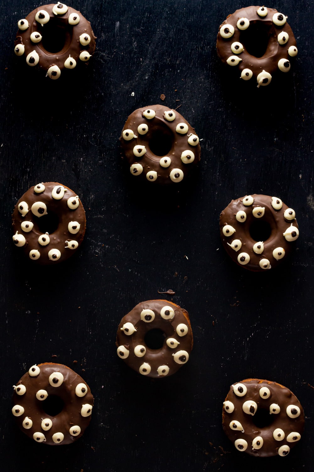Donuts zoiudos são apenas donuts cobertos com chocolate e também com pequenos olhos feitos de chocolate branco.