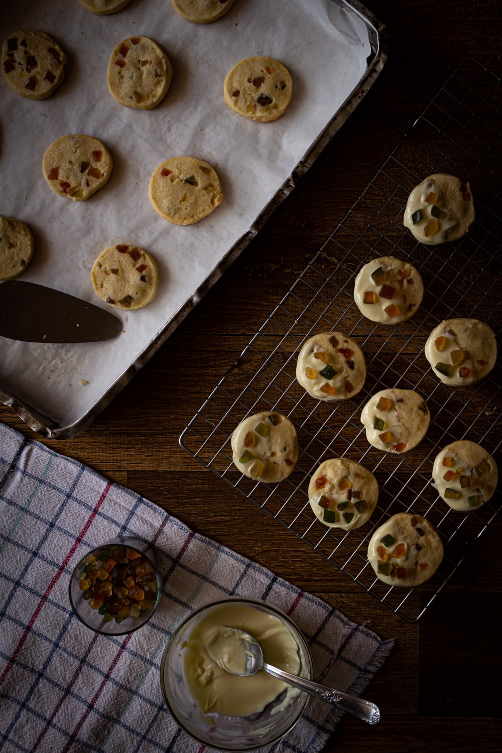 - Para a cobertura derreta o chocolate, e tempere caso queira garantir que fique seco ao toque e não derreta no calor. Cubra metade dos biscoitos, já frios, com o chocolate e espalhe as frutas cristalizadas por cima. Pra finalizar espalhe uma pitada de sal sobre os biscoitos.