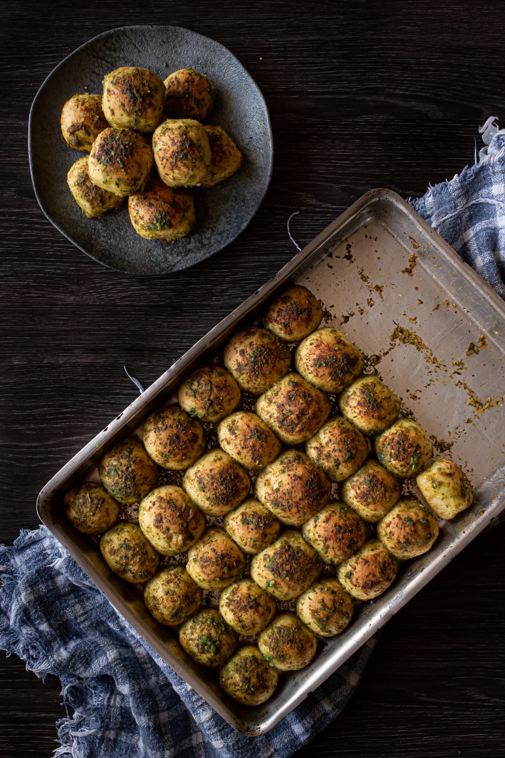 - Com a massa descansada divida em 45 pedaços, formando uma trouxinha com cada pedaço. Pegue uma trouxinha, faça dela uma bolinha de massa, passe no molho verde e então transfira para uma assadeira de cerca de 22x33cm. A assadeira não precisa ser untada.Se quiser, boleie 4 a 5 pedaços de massa e coloque no molho e depois pesque todos com um garfo. Facilita o trabalho.