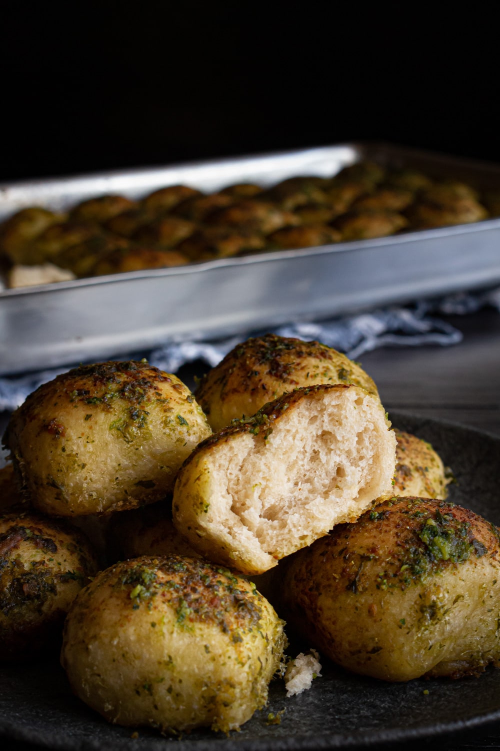 A ideia começou quando vi uns pãezinhos gringos que eram assados cobertos com um molho picante. Não sou muito da pimenta e fiquei pensando como aquela receita ficaria com um pesto no lugar do molho picante. E foi daí que comecei a estudar e testar.