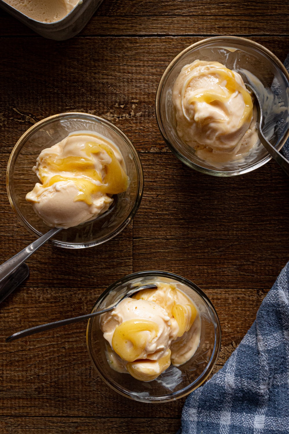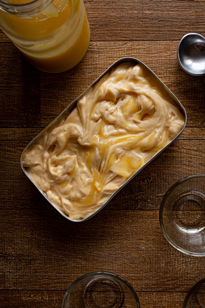 - Transfira o sorvete para uma vasilha, coloque o restante do curd em colheradas e use uma colher para mesclar um pouco no sorvete.