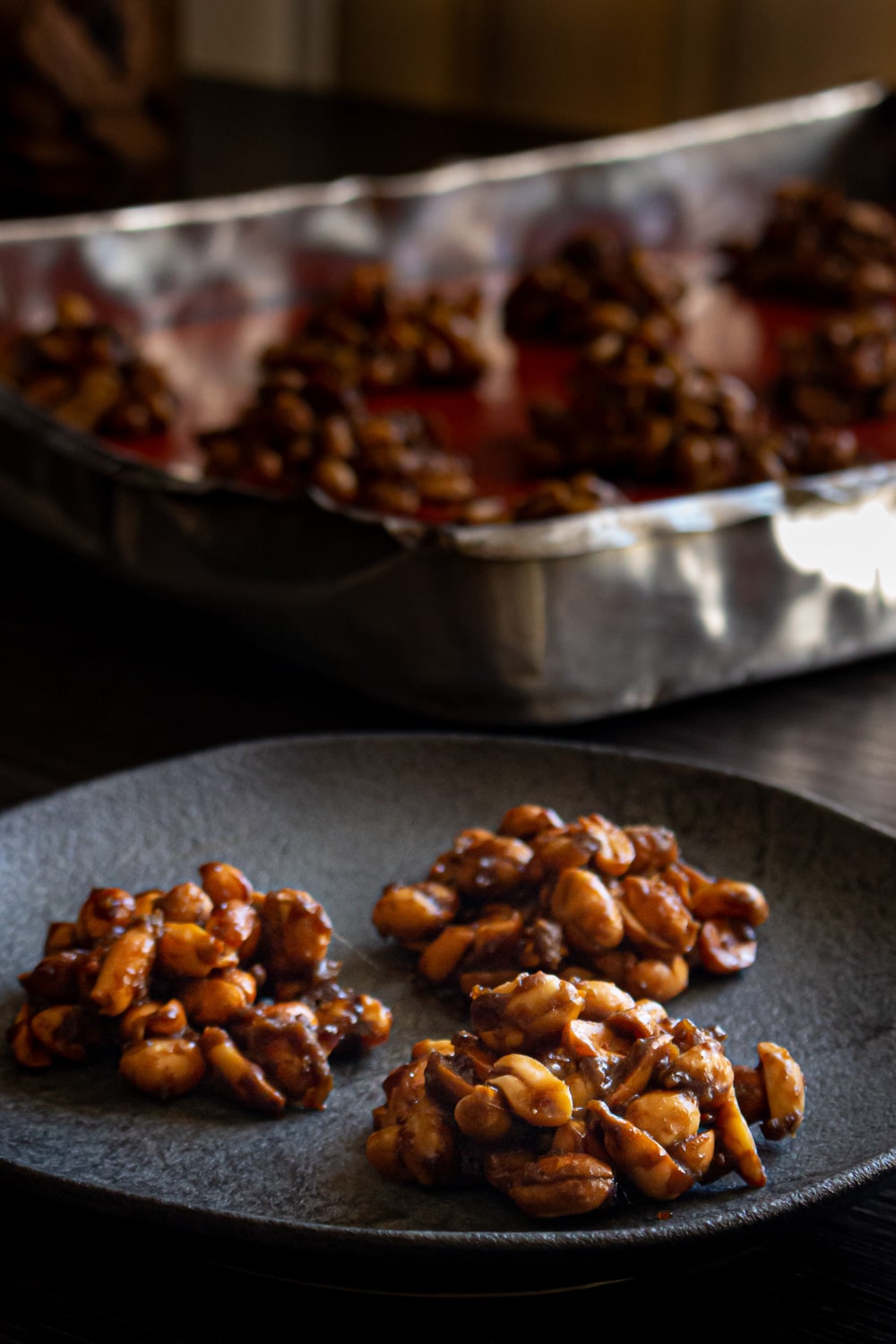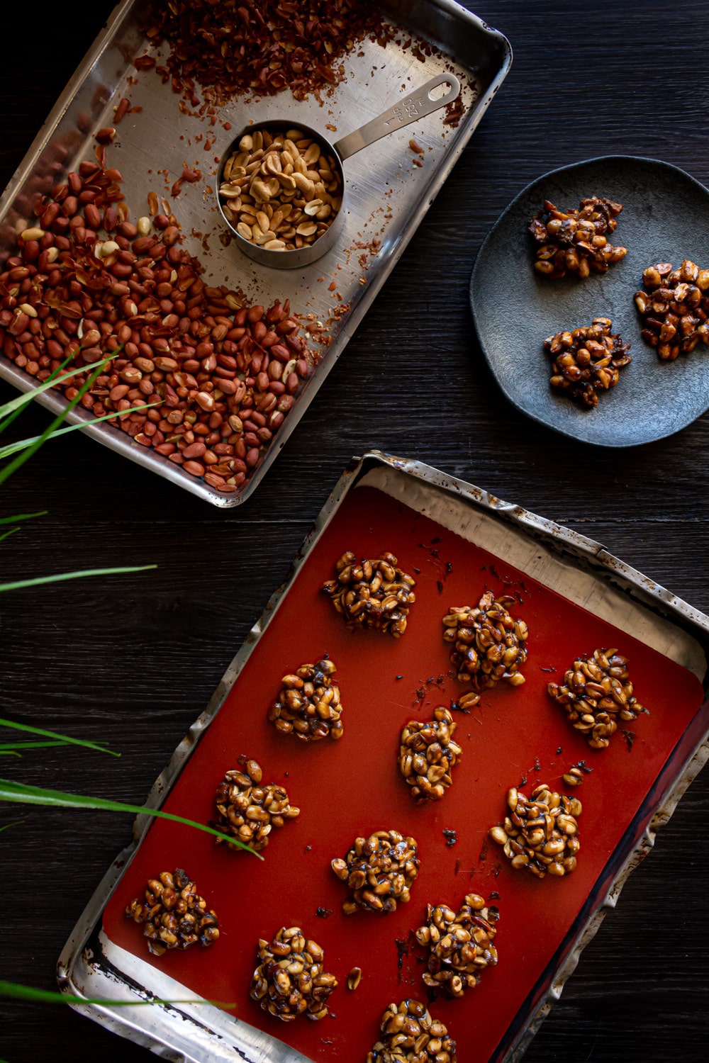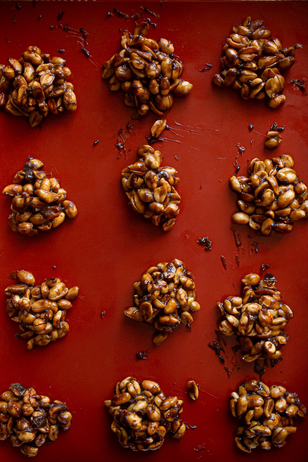 Por último uma dica que não foi possível pra mim mas pode ser pra você. Tradicionalmente cada montinho de pé de moleque é formado em cima de pedaços de folha de bananeira. Na falta delas eu usei um tapete de silicone mesmo, mas fiquei com vontade de testar assim.