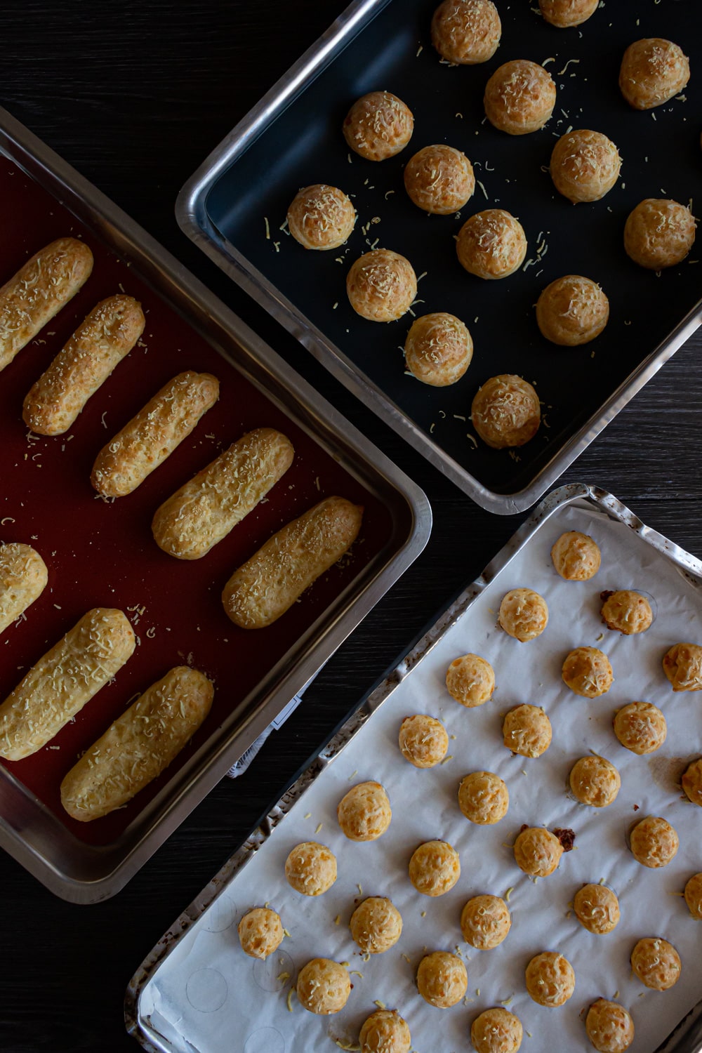 Por último, queria falar dos formatos. A receita original falava pra fazer bolinhas com cerca de 2,5cm e pra isso eu cortei a ponta do saco de confeiteiro com cerca de 1cm. Eu usei o mesmo saco de confeiteiro pra fazer uma versão bolinhas maior e pra fazer a versão comprida tipo bomba. Você pode fazer versões maiores ou menores conforme o que preferir. Eu não gostei muito da versão tipo bomba porque ela tem uma proporção maior de miolo do que as versões bolinha. E como não inflou tanto acabou não ficando tão gostoso. Imagino que a receita ficando “perfeita” essa versão fique sim bem gostosa.