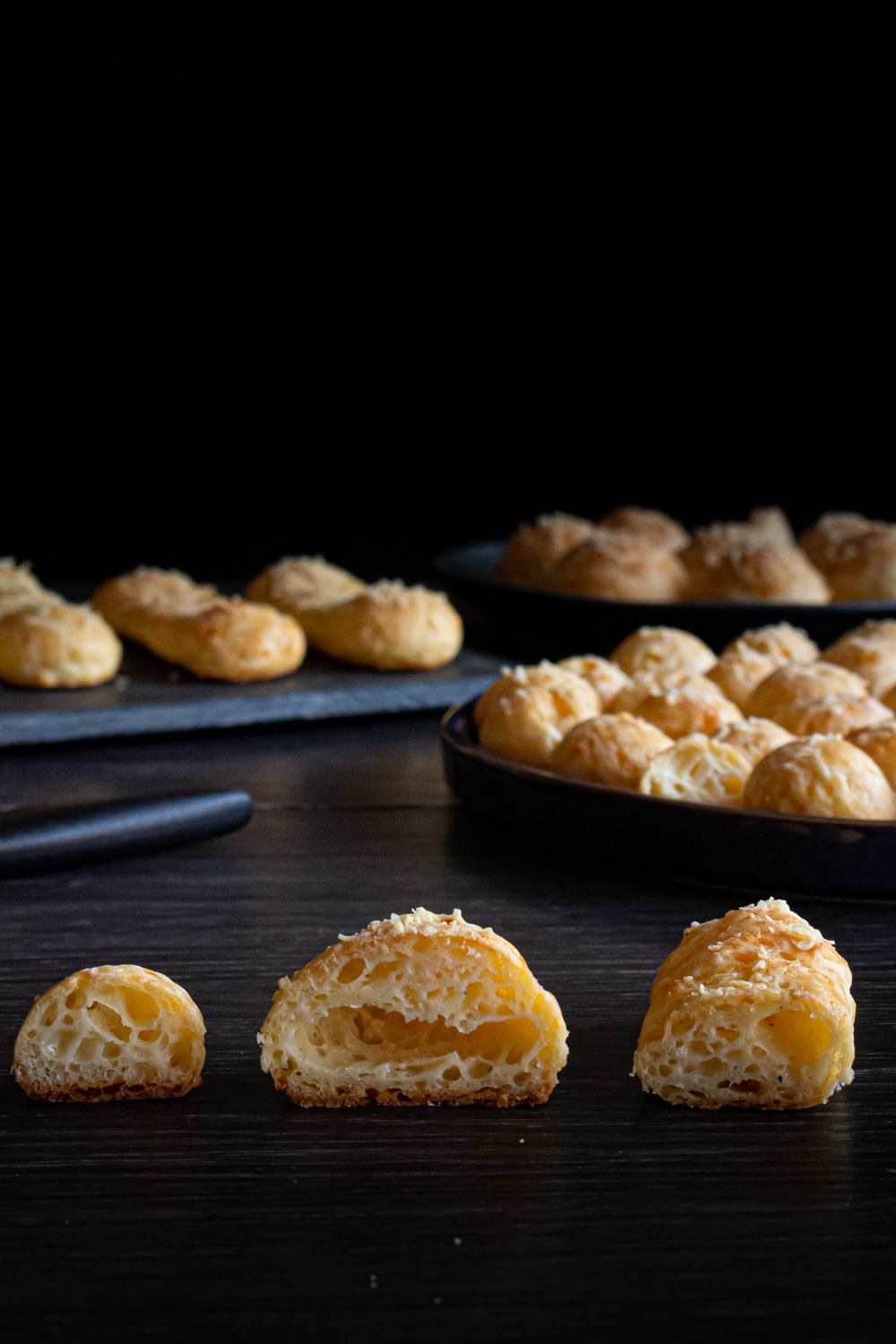 Como é possível ver nas fotos, a massa assada inflou sim, mas os gougères não ficaram bem ocos como deveriam. Isso é um problema técnico que pode ser resolvido com bastante treino e intimidade com a receita. O que eu pretendo ter já que, com eu disse, a gente gostou bastante do resultado. Mas eu quis deixar esse registro aqui pra lembrar que a receita não precisa ficar perfeita pra ficar gostosa. E que muitas vezes a gente precisa fazer uma receita várias vezes pra conseguir “acertar o ponto”.