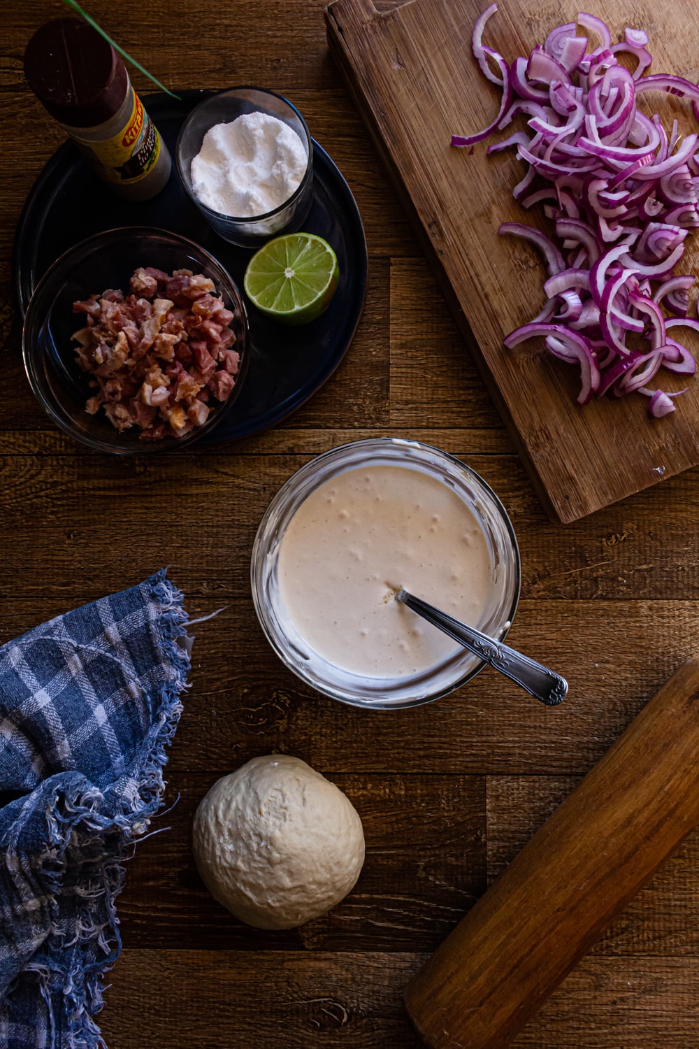 Falando no recheio, vamos aos detalhes dele. O tal lardon que as receitas falam é apenas um corte diferente de bacon. Se você tiver um pedaço grande de bacon é só picar em pedaços compridos. Se você só tiver bacon já cortado em cubinhos não tem problema. A cebola é uma dúvida minha: das receitas que li nenhuma especifica o tipo de cebola, apenas dizem pra cortar em fatias. Mas pesquisando imagens, (quase) todas as tarte flambées eram com cebola branca, e (quase) todas as flammkuchen eram com cebola roxa. Portanto, com cebola roxa eu fiz. E portanto faça com a que você preferir.