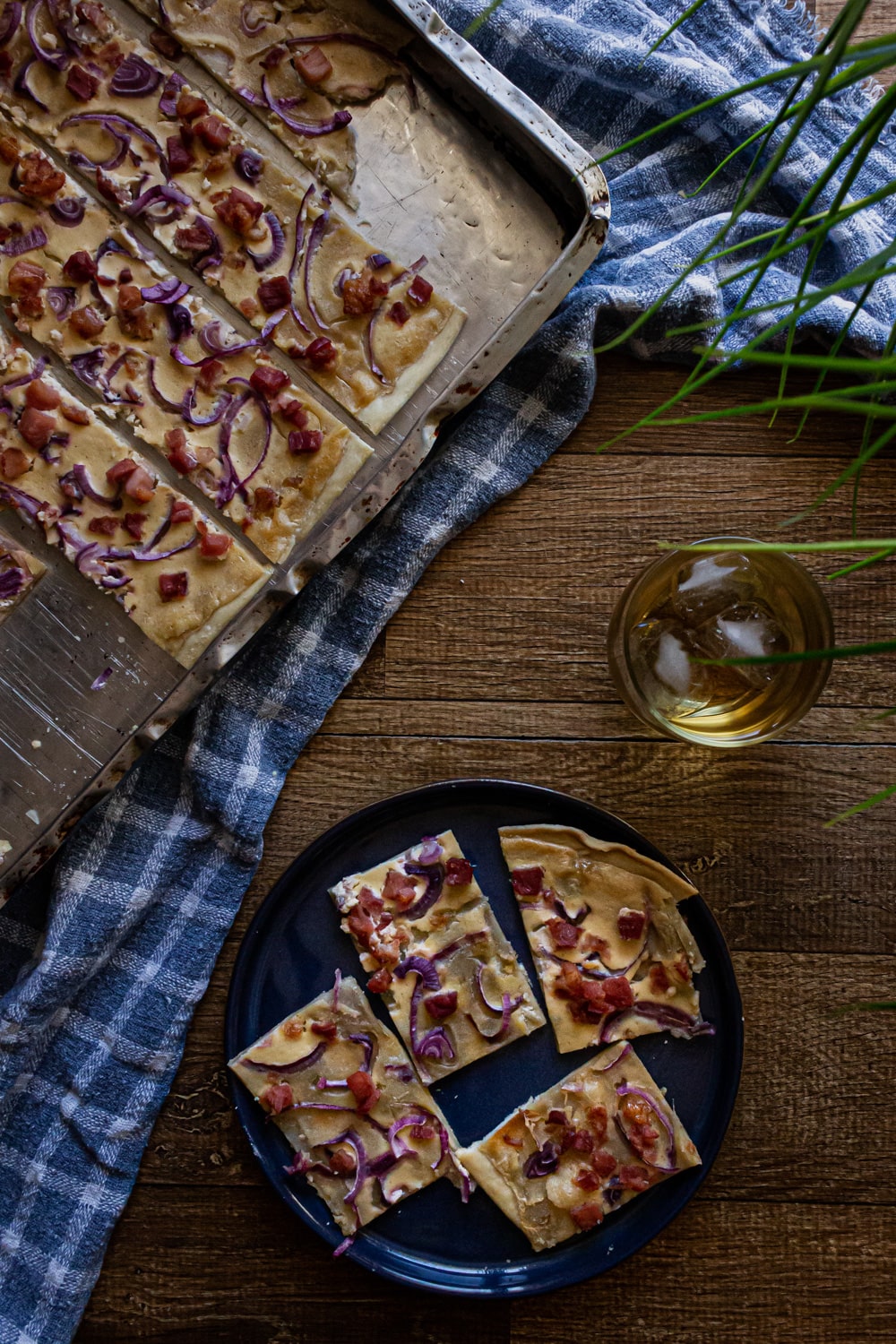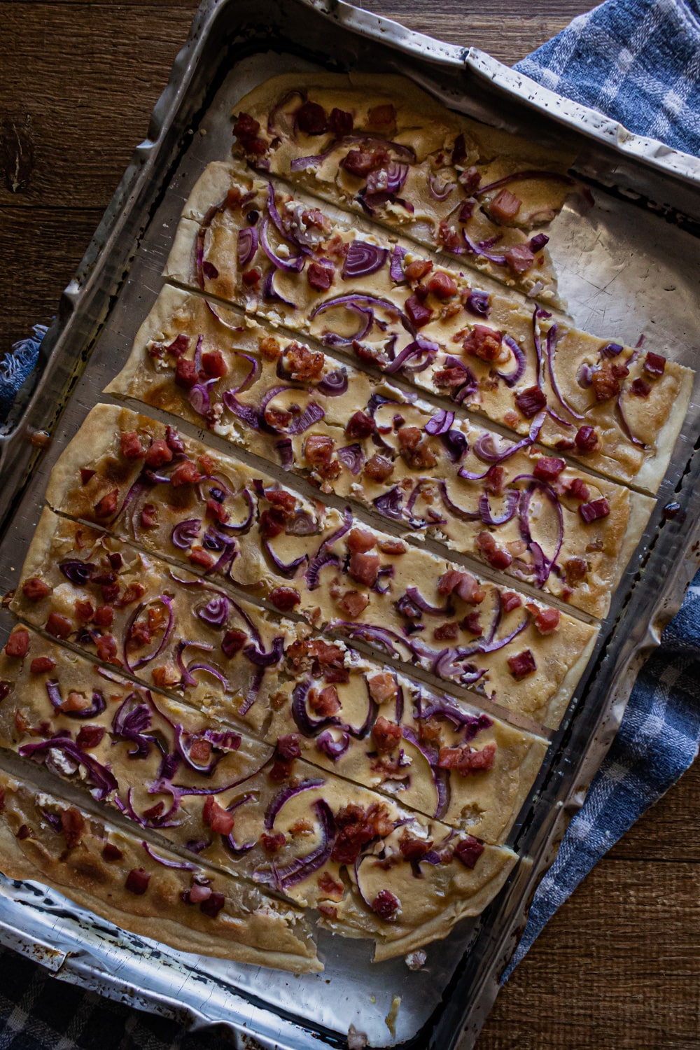 Flammkuchen é uma massa, tipo de pão, aberta bem fina e assada com uma cobertura de creme azedo, cebolas e bacon.