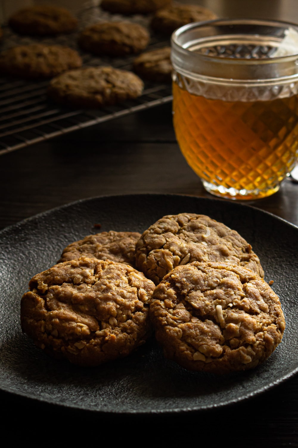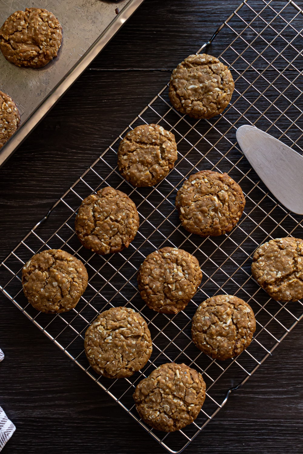 Essa ligação entre os dois países começa pelo nome deles: ANZAC é o acrônimo de Australian and New Zealand Army Corps, meio que as forças armadas conjuntas desses países que foram estabelecidas como um corpo só na Primeira Guerra Mundial. O que um biscoito tem a ver com veteranos de guerra? Parece que durante a guerra as famílias (basicamente mães, esposas e filhas) dos soldados enviavam esses biscoitos pra aqueles que estavam no front. Essa receita específica teria sido escolhida por conta dos seus ingredientes que não estragam fácil, assim os biscoitos aguentavam as longas viagens marítimas.