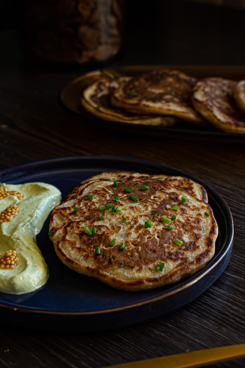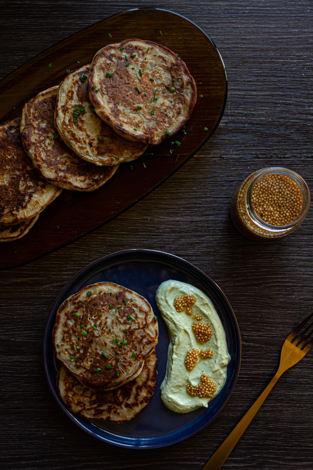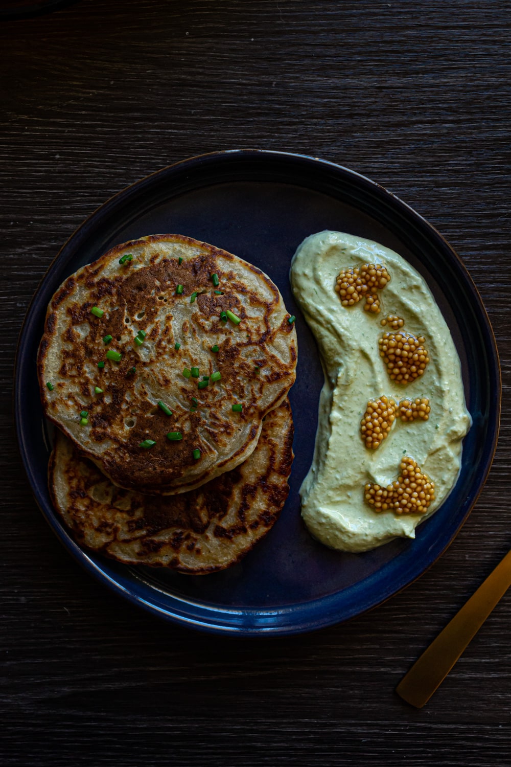 Por último, acompanhamentos! Vale o que você quiser! Mas eu acho que um molho mais ácido e fresco combina bem com as texturas e sabores dessa panqueca. Nas fotos é um tofu processado com ervas frescas, limão e sal; e uma colheradas de mostarda fermentada. Acho que acabou complementando muito bem.