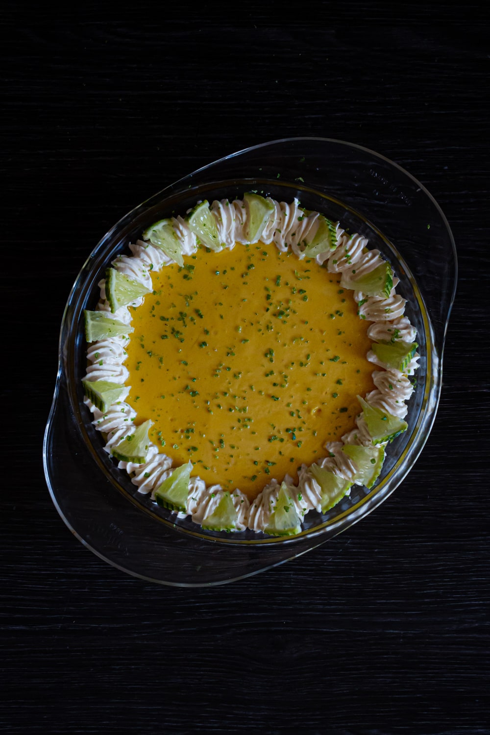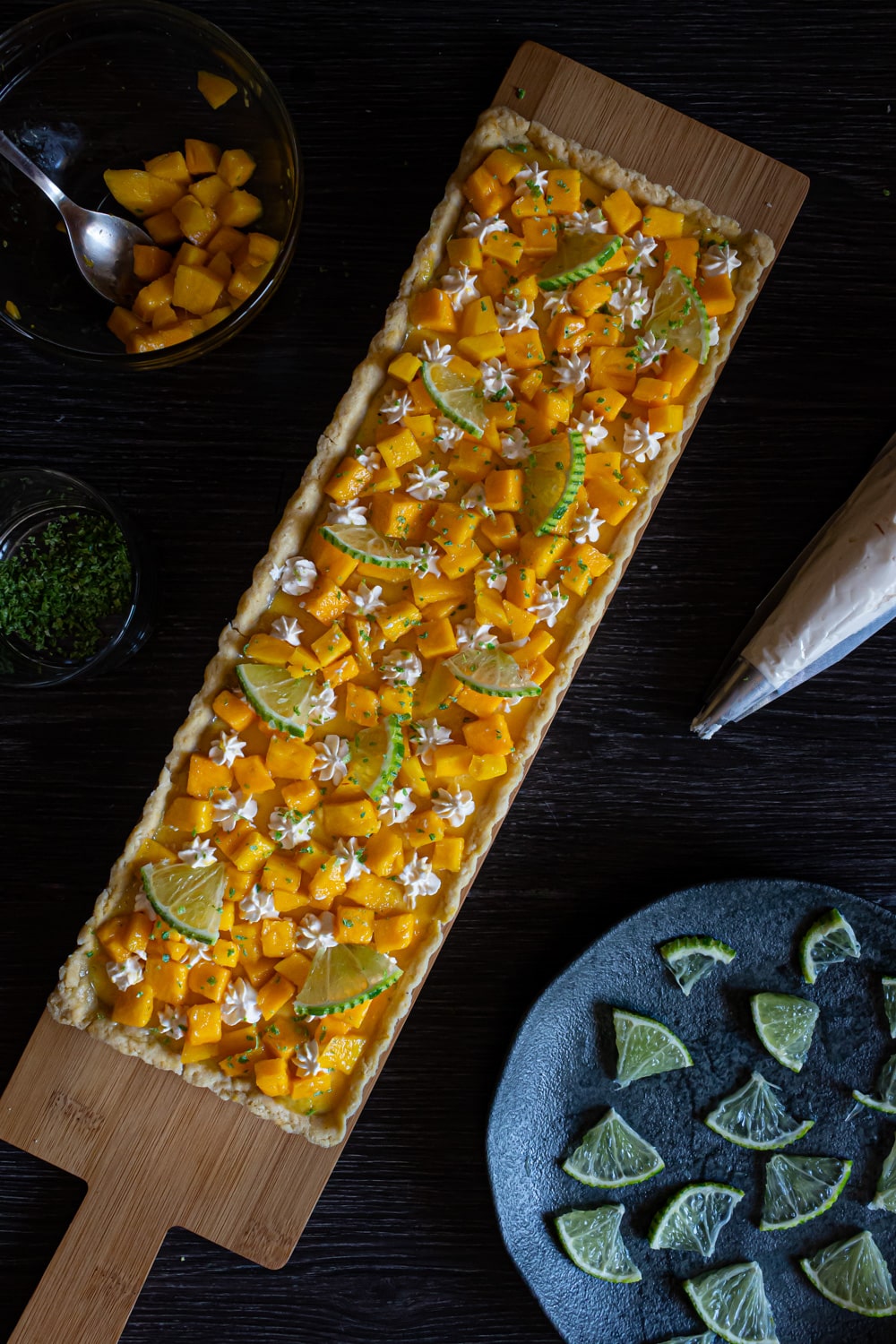 - Com o saco de confeitar faça estrelinhas de creme espalhadas no topo da torta. Entre elas espalhe os pedacinhos de manga. Por cima espalhe as fatias de limão e finalize com as raspas.