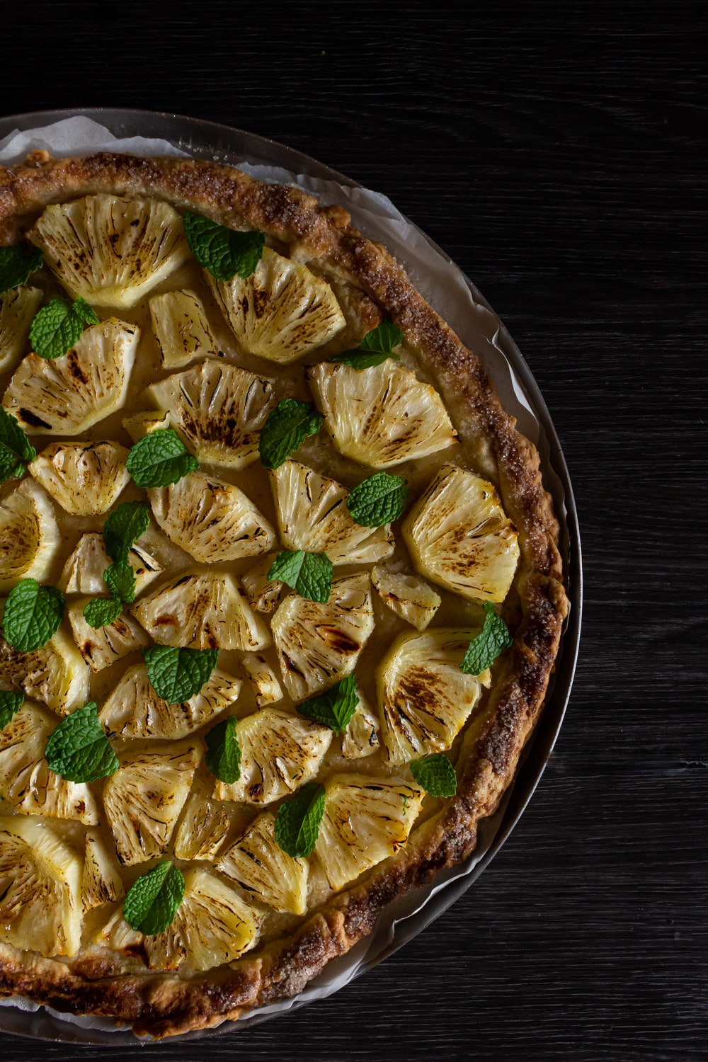 - Com a torta assada, use um maçarico pra acabar de tostar o abacaxi sem queimar demais a massa.Pincele a calda sobre o abacaxi e finalize com folhas de hortelã logo antes de servir.